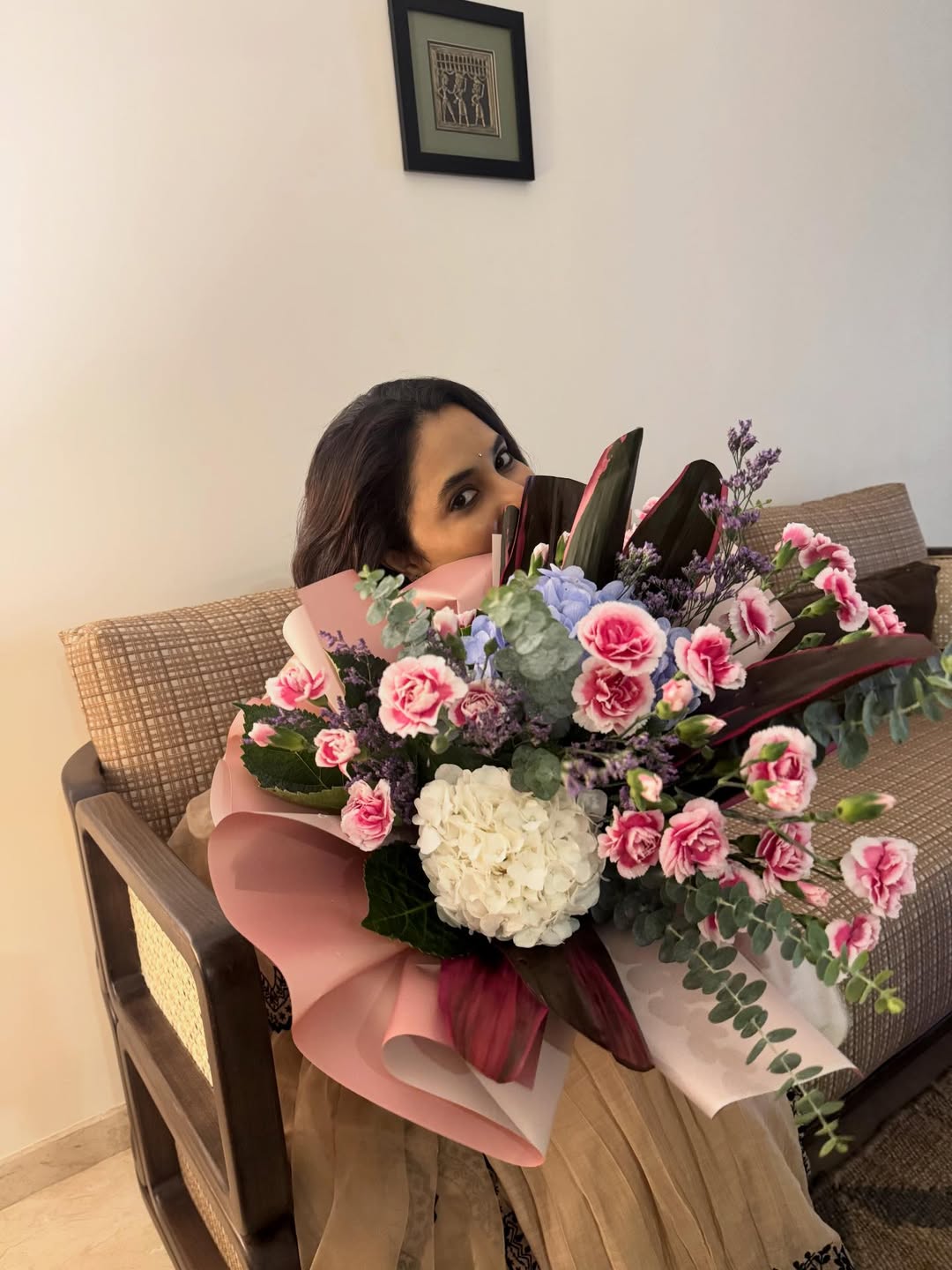 On November 20, 2025, she shared joyful moments on social media, posing with a chocolate cake and a vibrant floral arrangement featuring striking orange lilies.