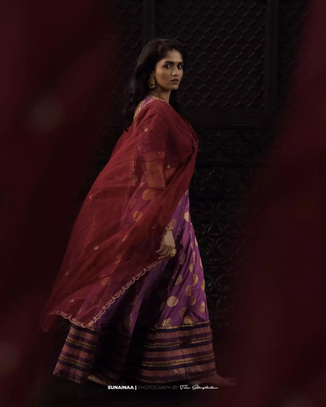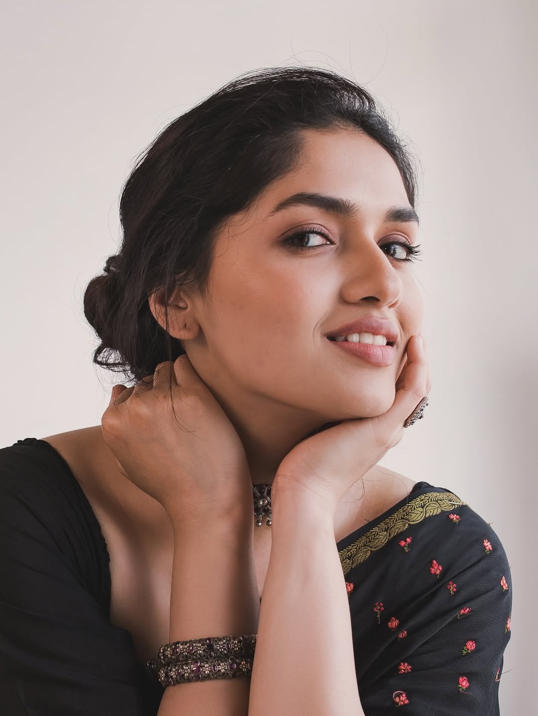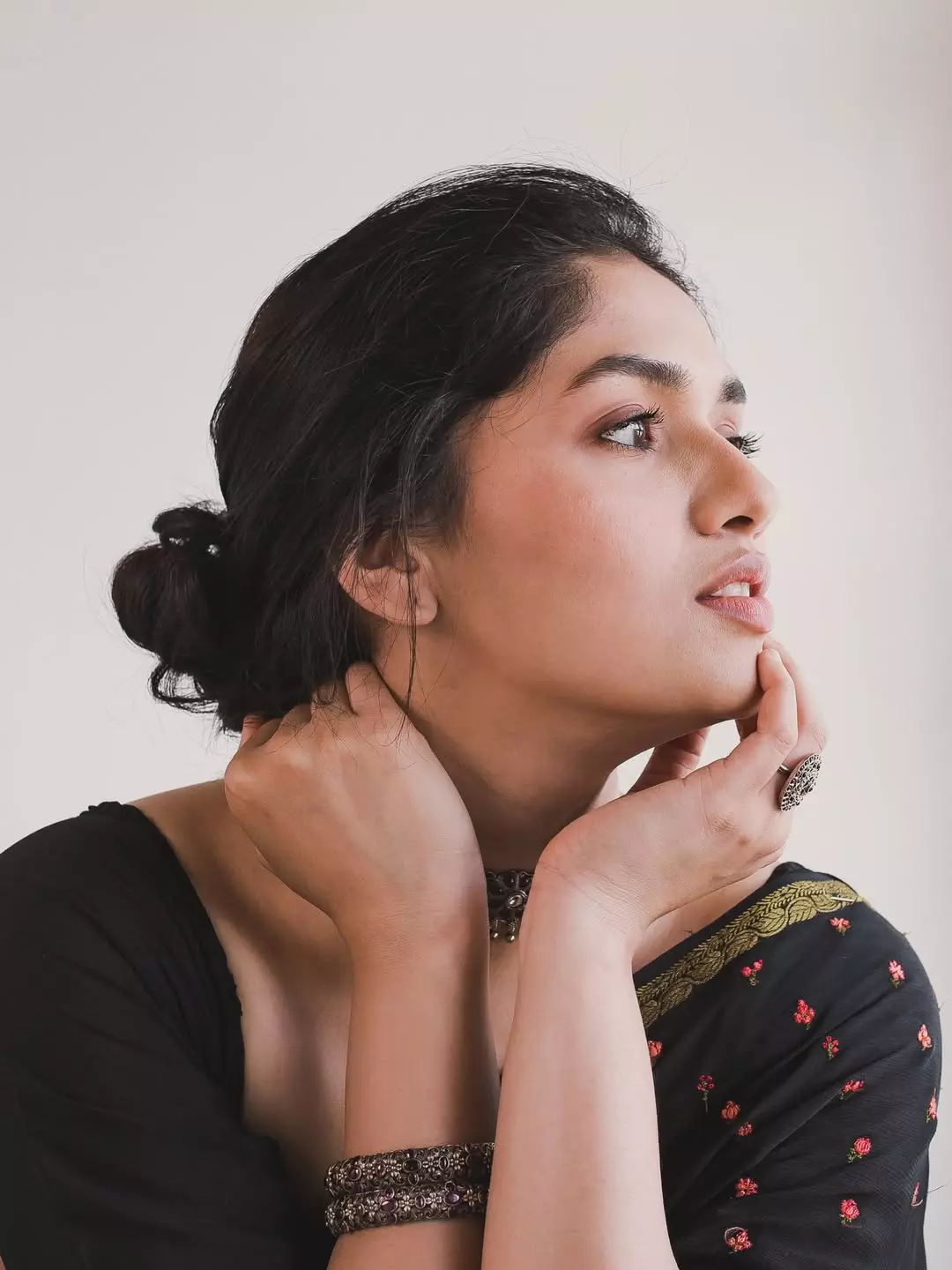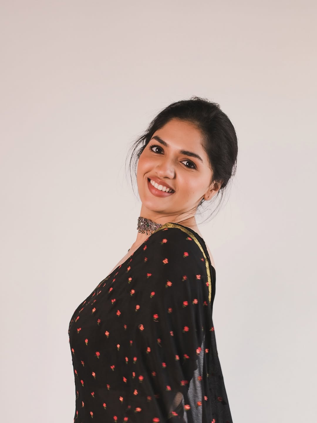 In this captivating frame, Sunainaa blooms with effortless allure, her black saree adorned with delicate red floral motifs and a golden border draping her form like midnight petals kissed by dawn. With a playful glance over her shoulder, her doe eyes sparkle with mischief, complemented by a radiant smile that reveals her nose ring's subtle gleam. Her neatly pinned bun and ornate choker necklace, paired with stacked bangles, evoke timeless elegance against a minimalist backdrop, turning a simple pose into a symphony of grace and warmth. My favourite mood is a saree .