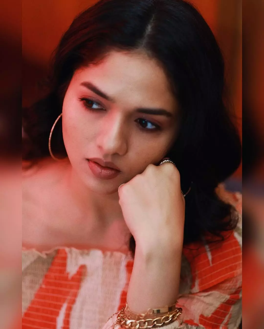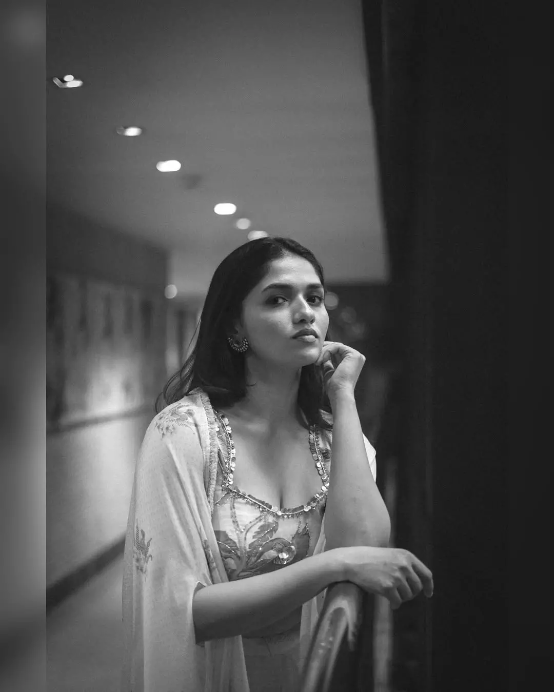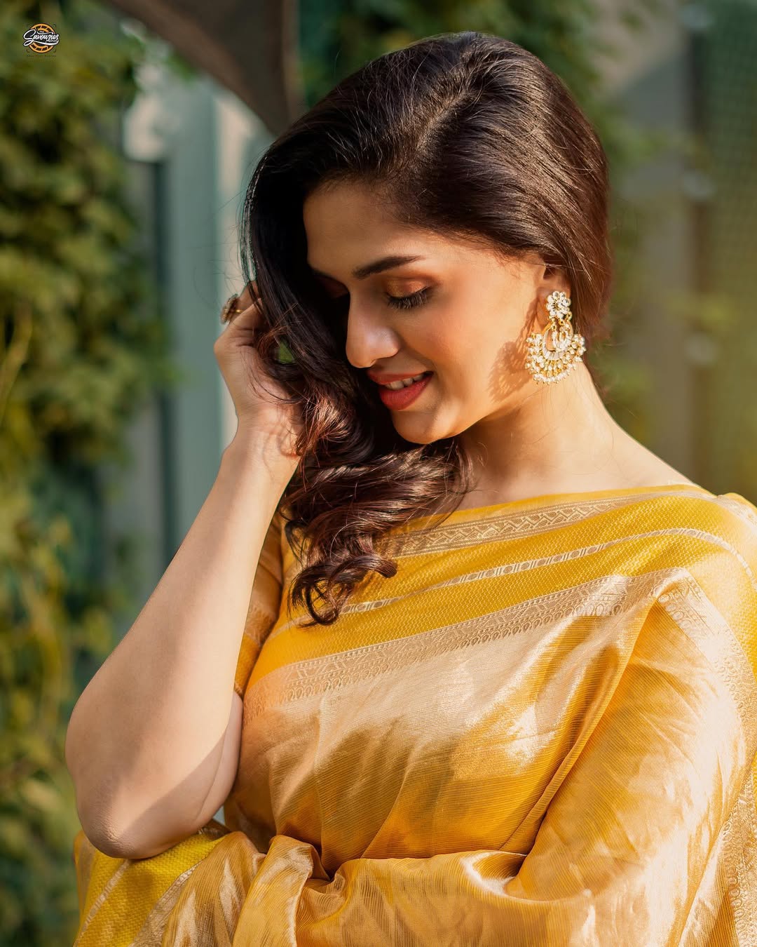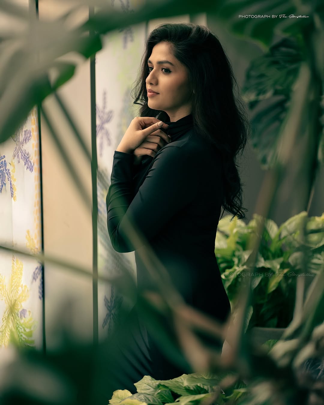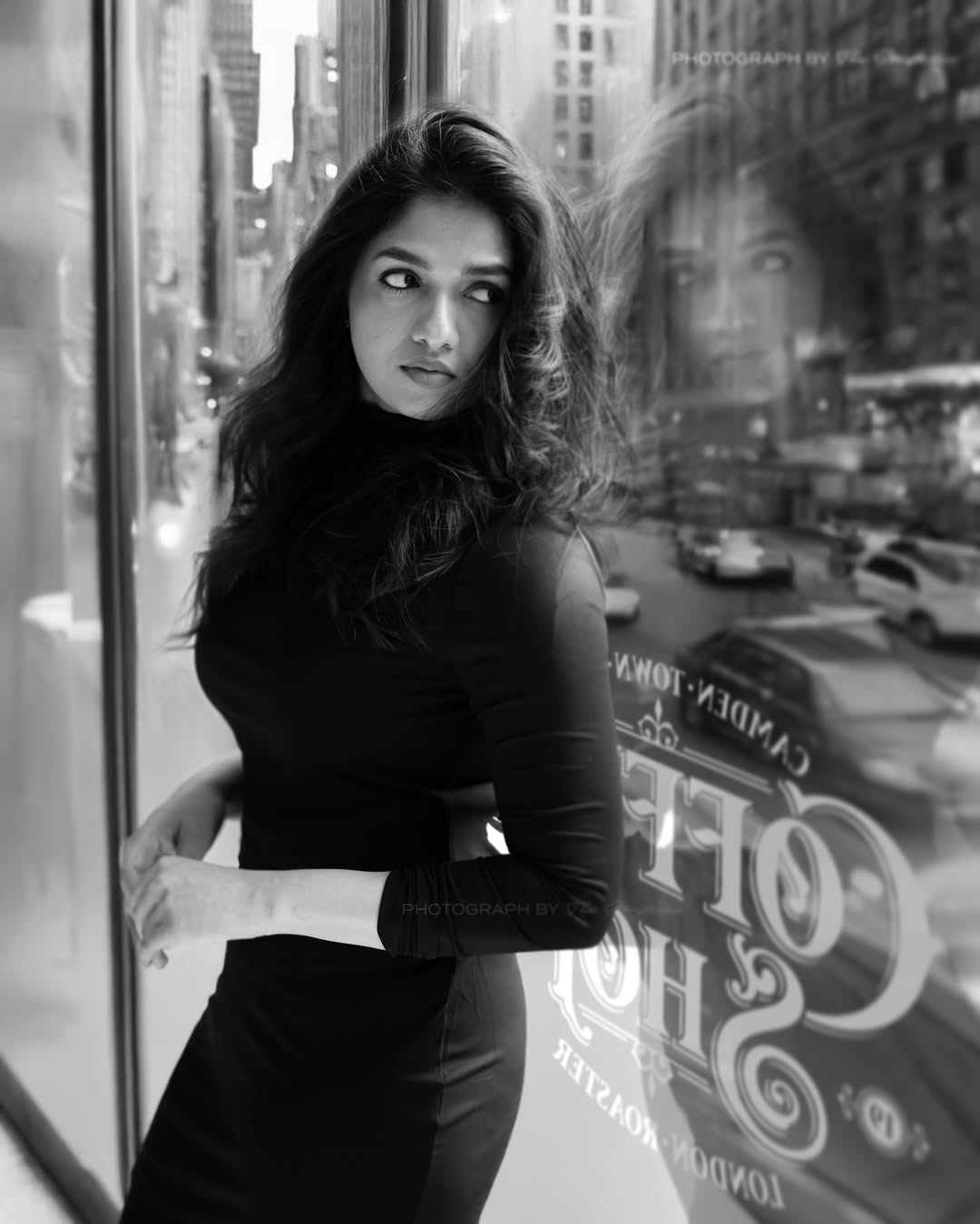 In this captivating frame, Sunainaa blooms with effortless allure, her black saree adorned with delicate red floral motifs and a golden border draping her form like midnight petals kissed by dawn. With a playful glance over her shoulder, her doe eyes sparkle with mischief, complemented by a radiant smile that reveals her nose ring's subtle gleam. Her neatly pinned bun and ornate choker necklace, paired with stacked bangles, evoke timeless elegance against a minimalist backdrop, turning a simple pose into a symphony of grace and warmth. My favourite mood is a saree .