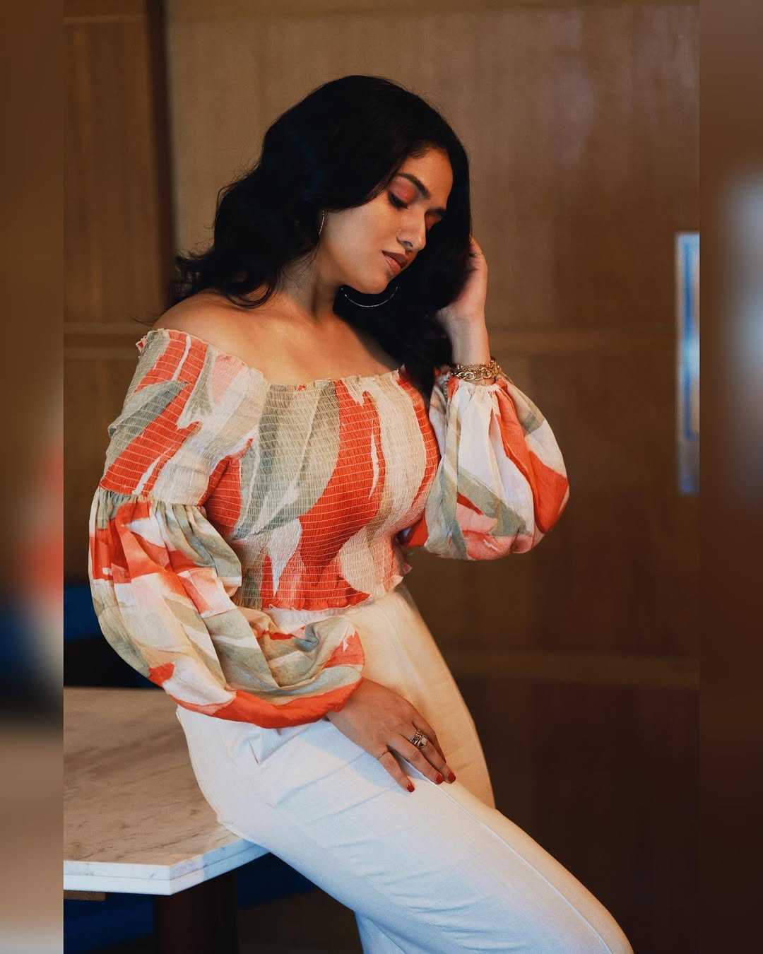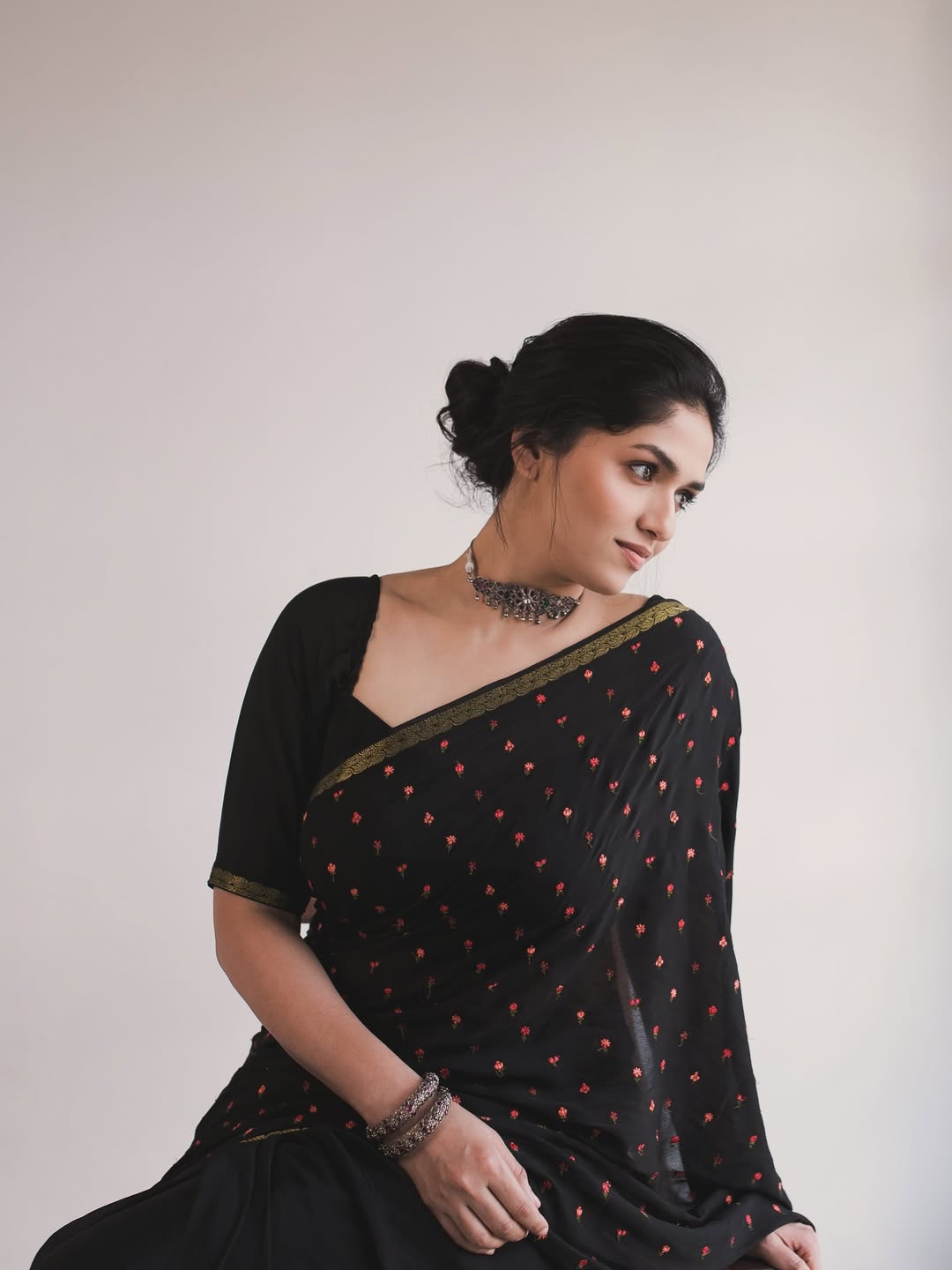 In this captivating frame, Sunainaa blooms with effortless allure, her black saree adorned with delicate red floral motifs and a golden border draping her form like midnight petals kissed by dawn
