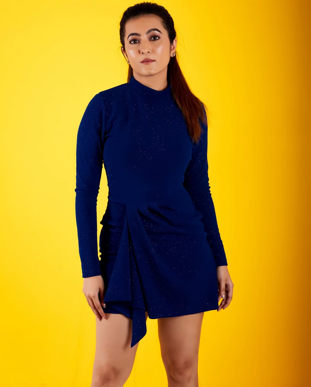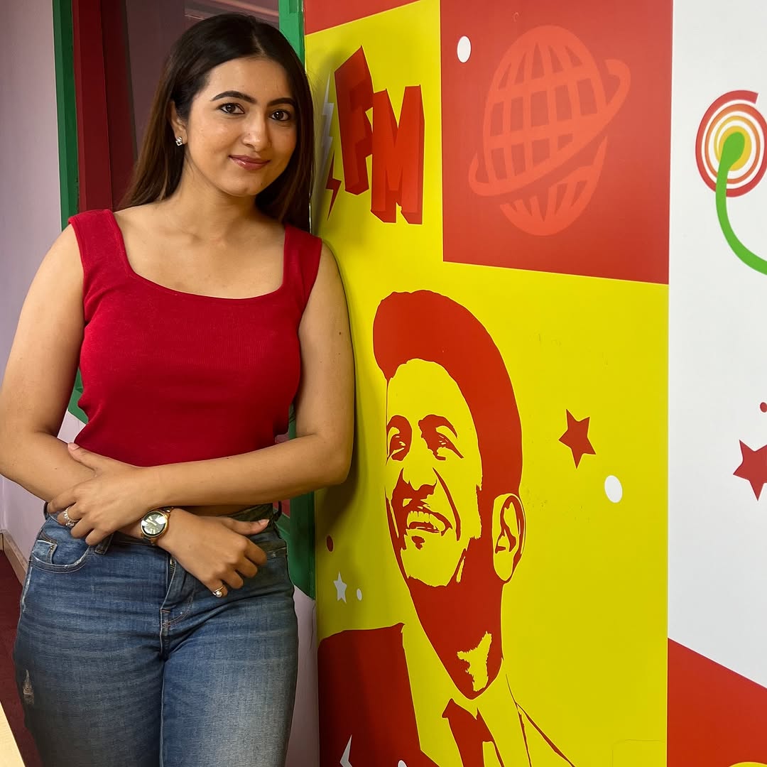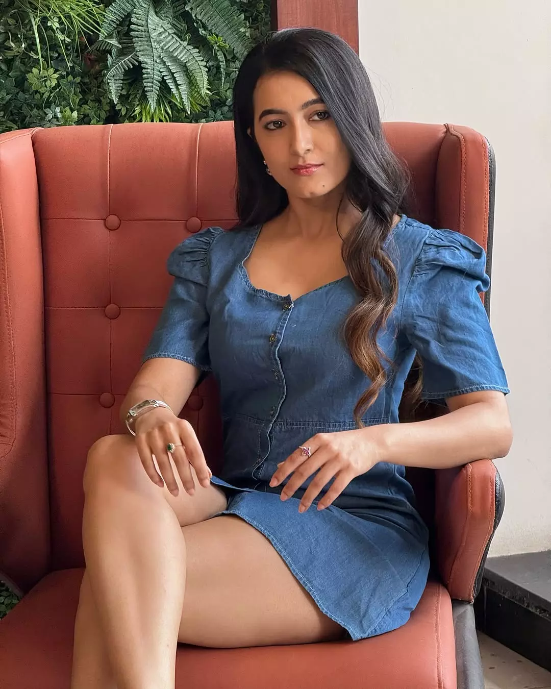 Beyond her acting prowess, Adhvithi is a true fashion icon, effortlessly blending elegance with contemporary trends. In this look, she stuns in a stylish denim mini dress, striking the perfect balance between casual chic and modern sophistication. The puffed sleeves, buttoned front, and flattering fit enhance her graceful charm. Complemented by soft waves, delicate jewelry, and minimal makeup, she radiates confidence and poise, embodying understated glamour.