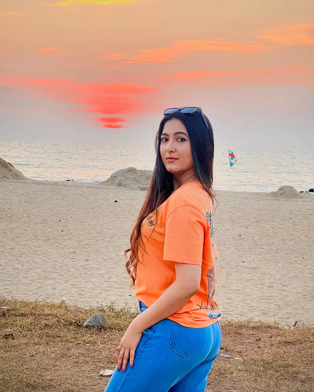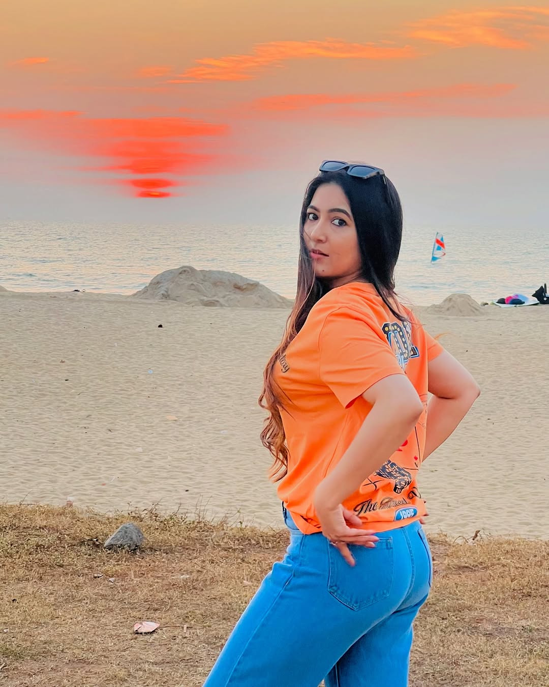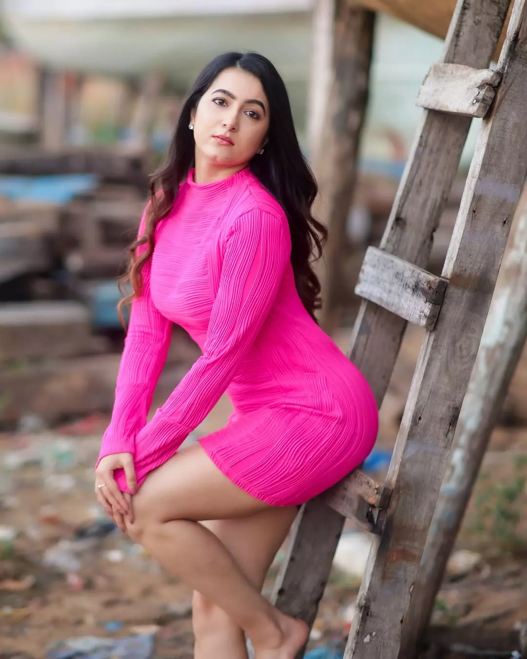 Beyond her acting prowess, Adhvithi is a true fashion icon, effortlessly blending elegance with contemporary trends. In this look, she stuns in a stylish denim mini dress, striking the perfect balance between casual chic and modern sophistication. The puffed sleeves, buttoned front, and flattering fit enhance her graceful charm. Complemented by soft waves, delicate jewelry, and minimal makeup, she radiates confidence and poise, embodying understated glamour.