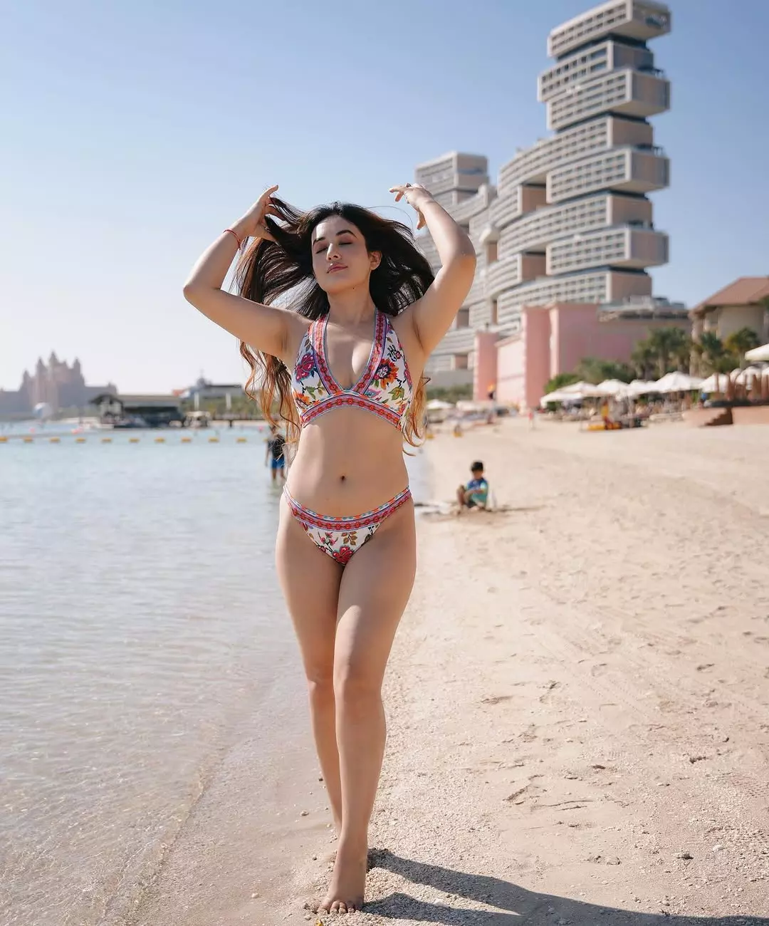 Aditi Budhathoki, the captivating Nepali actress and model born on June 28, 1995, in Kathmandu, Nepal, continues to mesmerize fans with her radiant beauty and confident style. In a breathtaking beach photoshoot, she poses on the golden sands of a scenic Goan or Nepali coastal spot, wearing a striking black-and-white patterned bikini that accentuates her toned figure. With long wavy hair flowing in the breeze, she kneels gracefully amid palm trees, lounge chairs, and the azure sea, exuding effortless allure under the bright tropical sun.