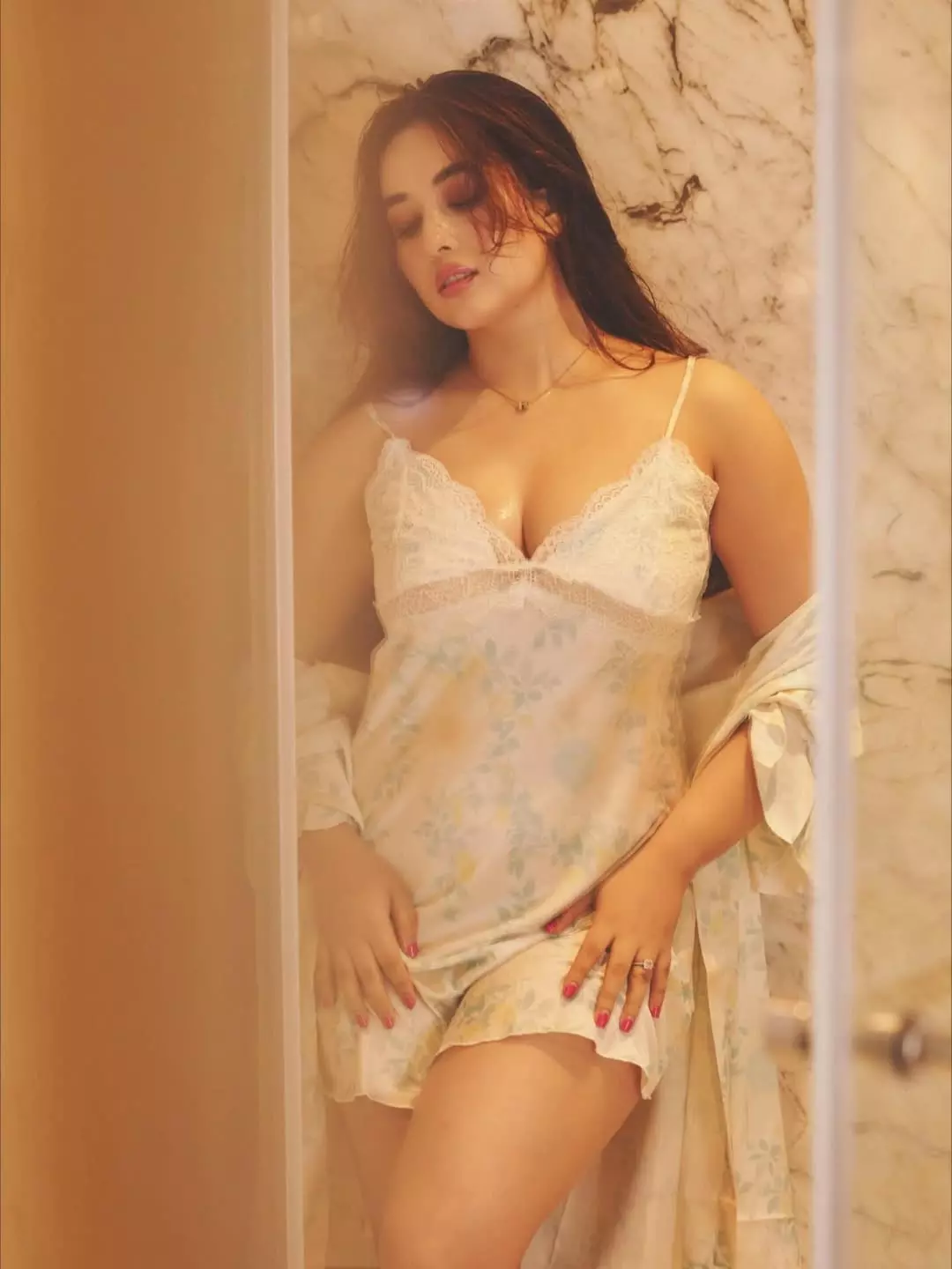 By: Tupaki Desk | 13 April 2026 11:55 PM ISTAditi Budhathoki captivates in this intimate self-portrait, running her fingers through her long, tousled brown hair while gazing confidently at the camera. Dressed in a delicate white ruched camisole with a low neckline, she radiates effortless sensuality and natural beauty in the warm indoor lighting.