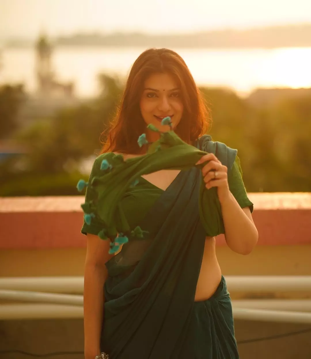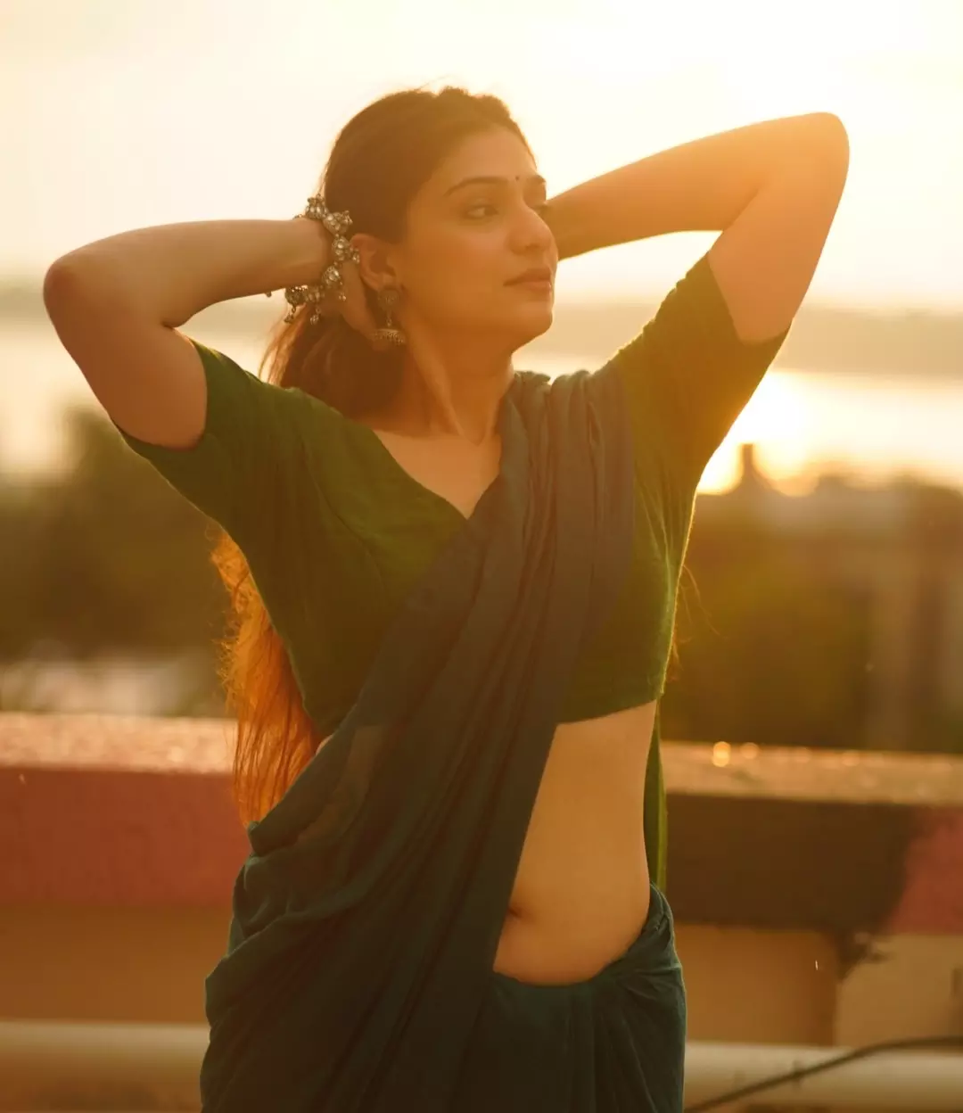In this stunning gallery, Aditi Gautam captures hearts with her effortless grace and radiant charm. Draped in a deep green saree, she stands against a glowing sunset backdrop, creating a magical blend of tradition and modern elegance. The warm golden light enhances her natural beauty, highlighting her expressive features and serene confidence.