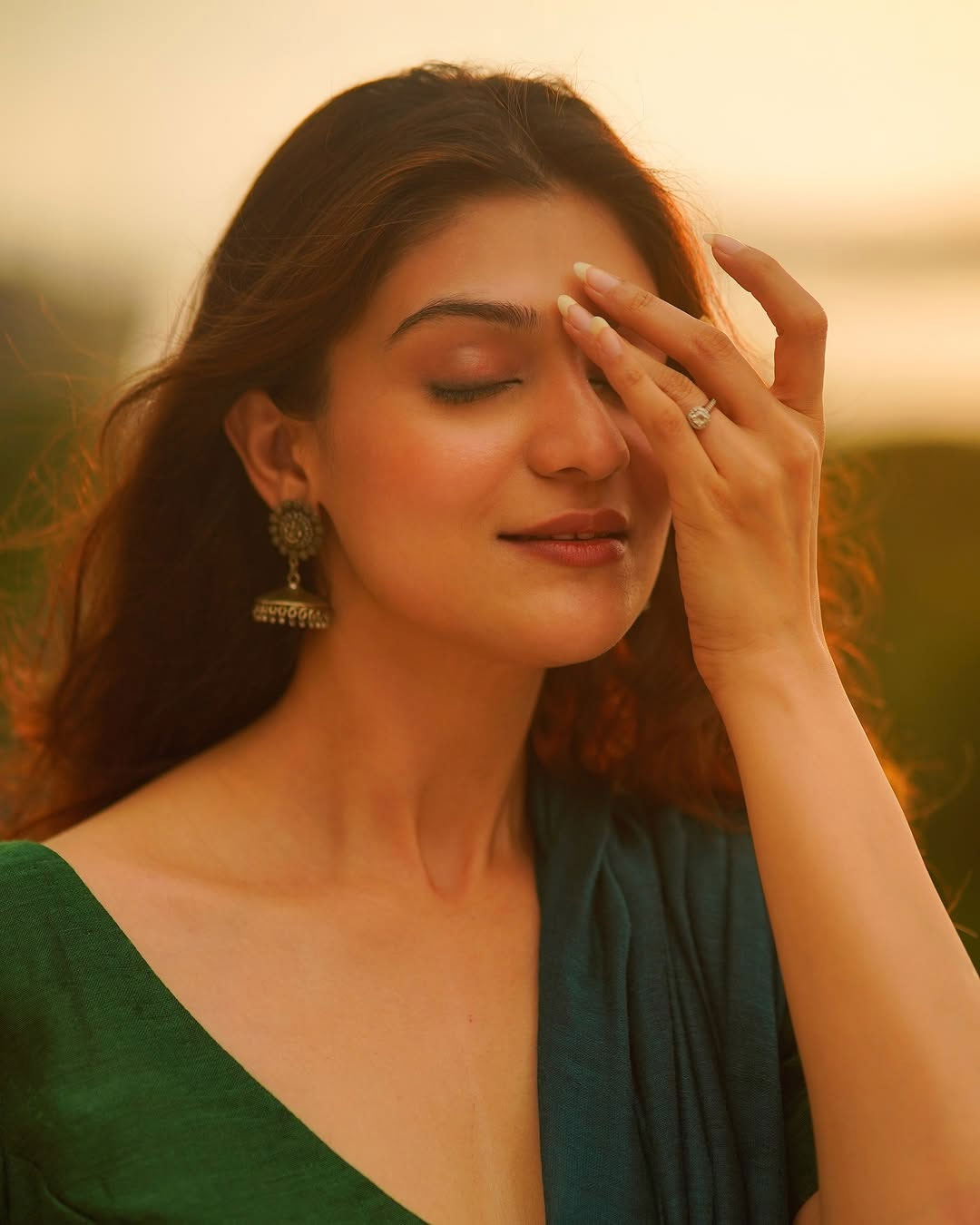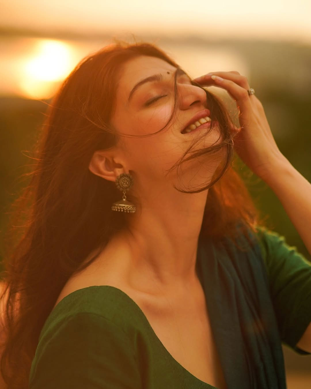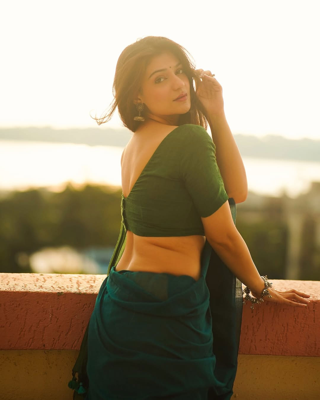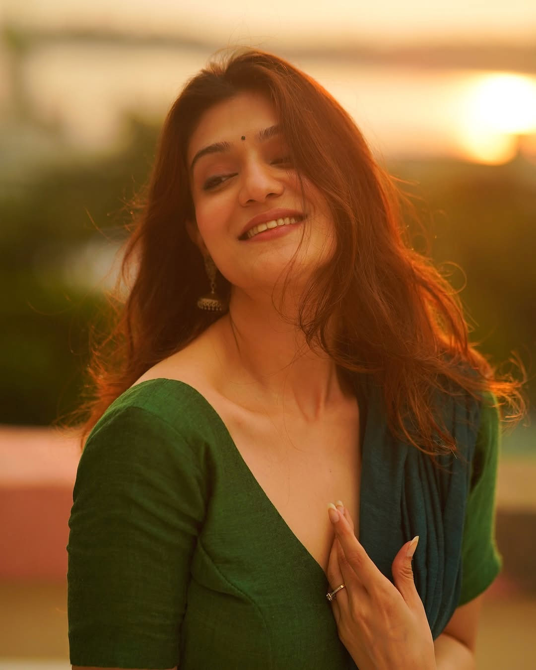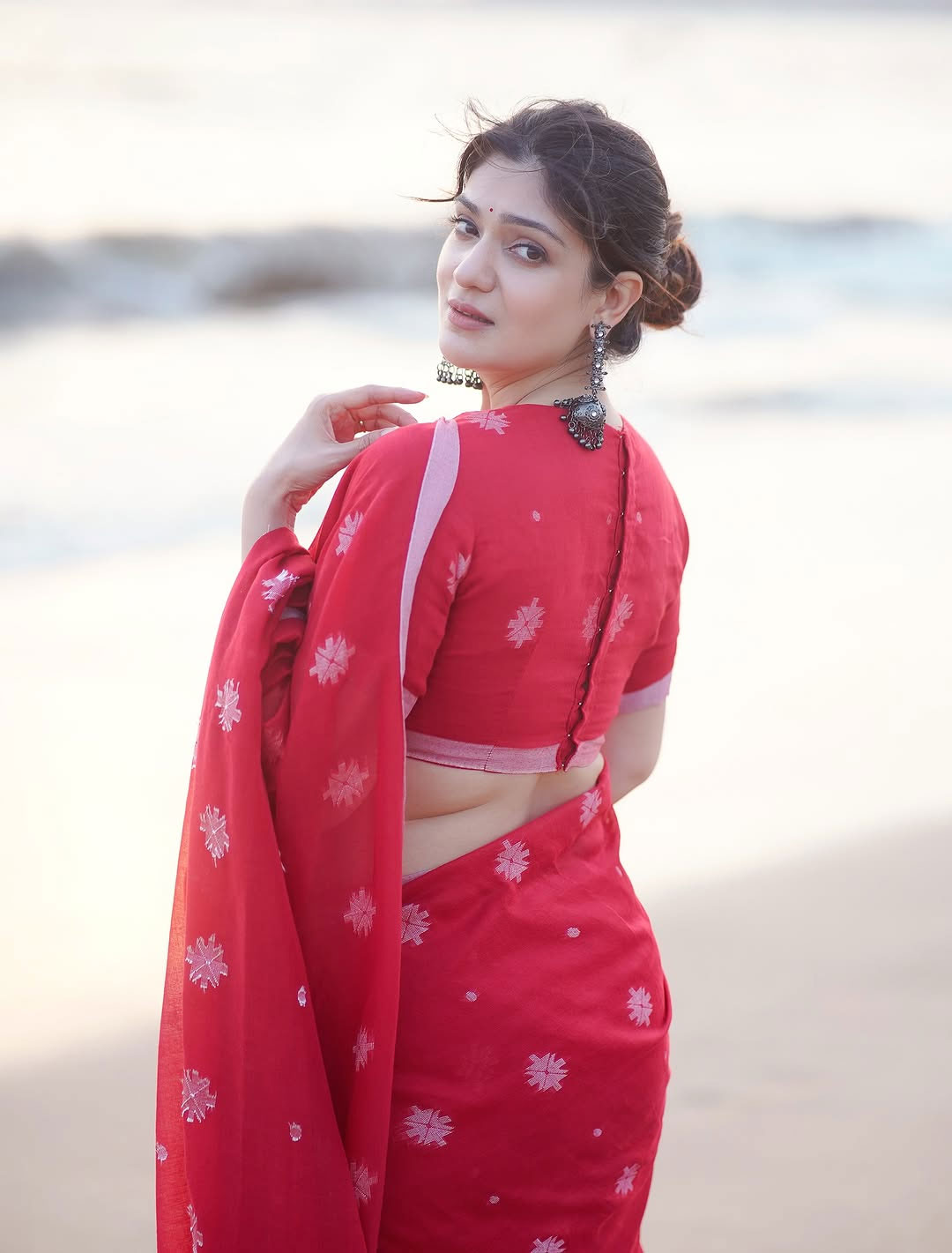 In the picture, Aditi is seen standing by the seaside, draped in a striking red saree adorned with delicate white floral patterns. She paired the traditional ensemble with elegant silver jhumkas, while the soft lighting and serene ocean backdrop added to the photograph’s charm, making it truly captivating.