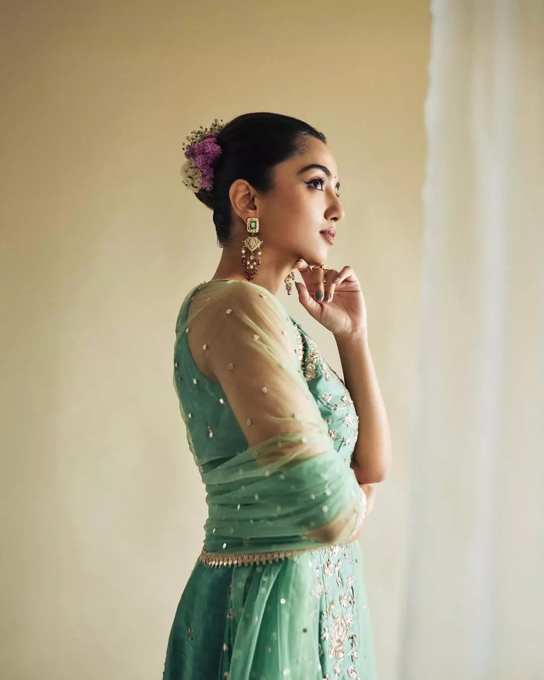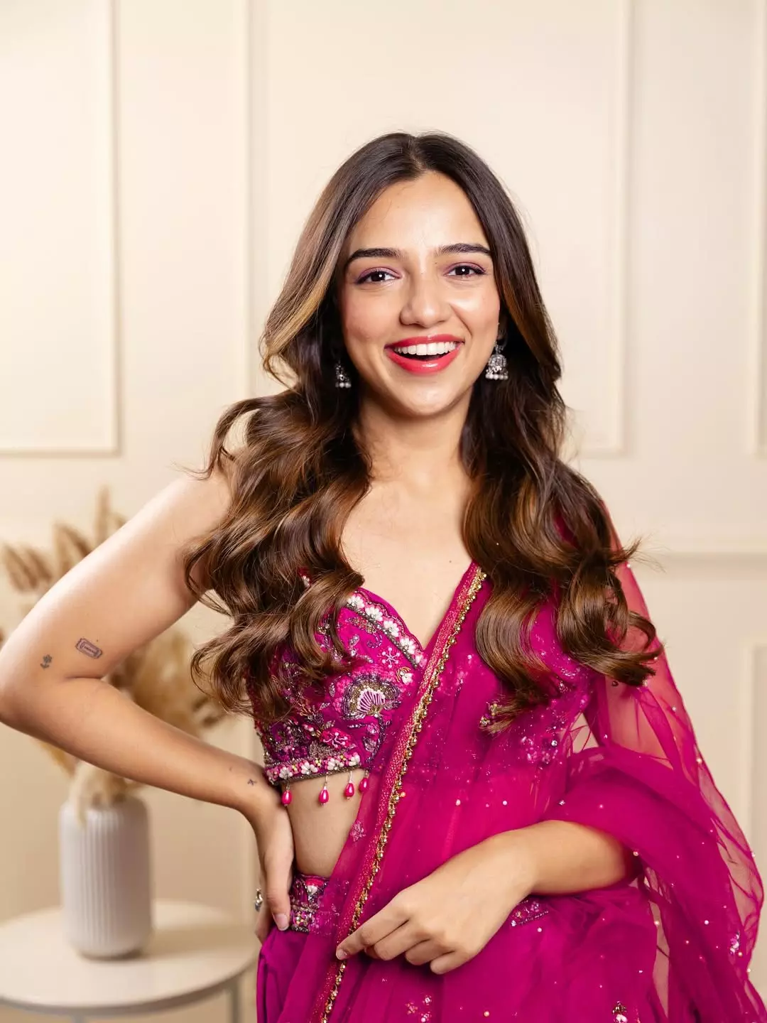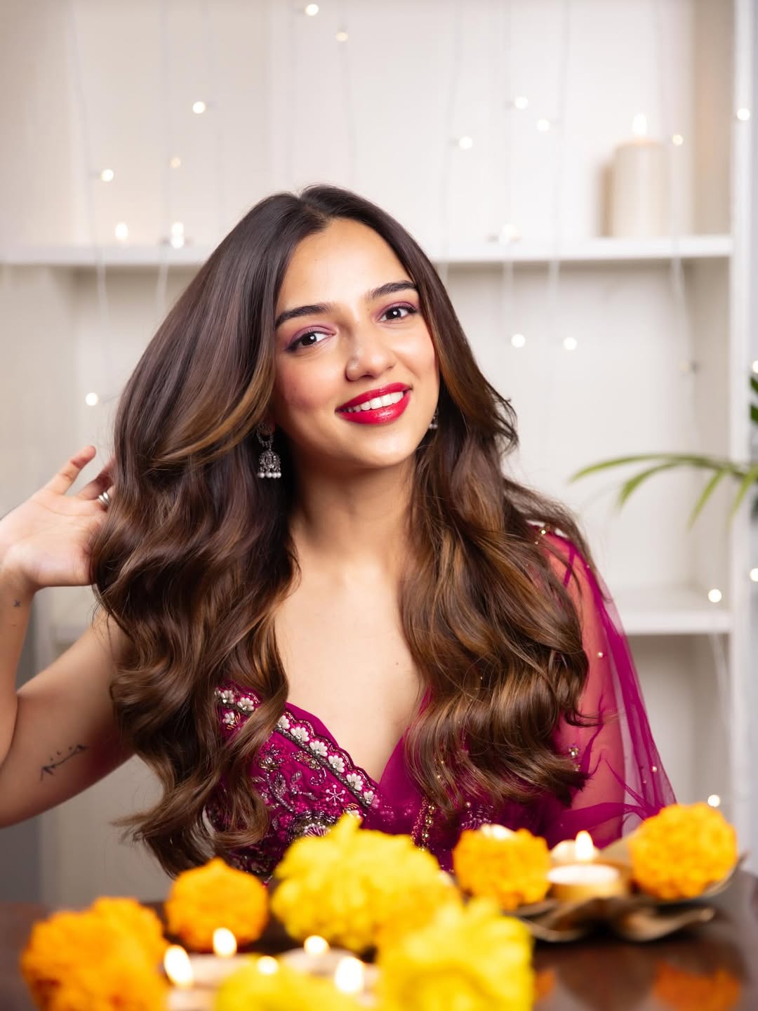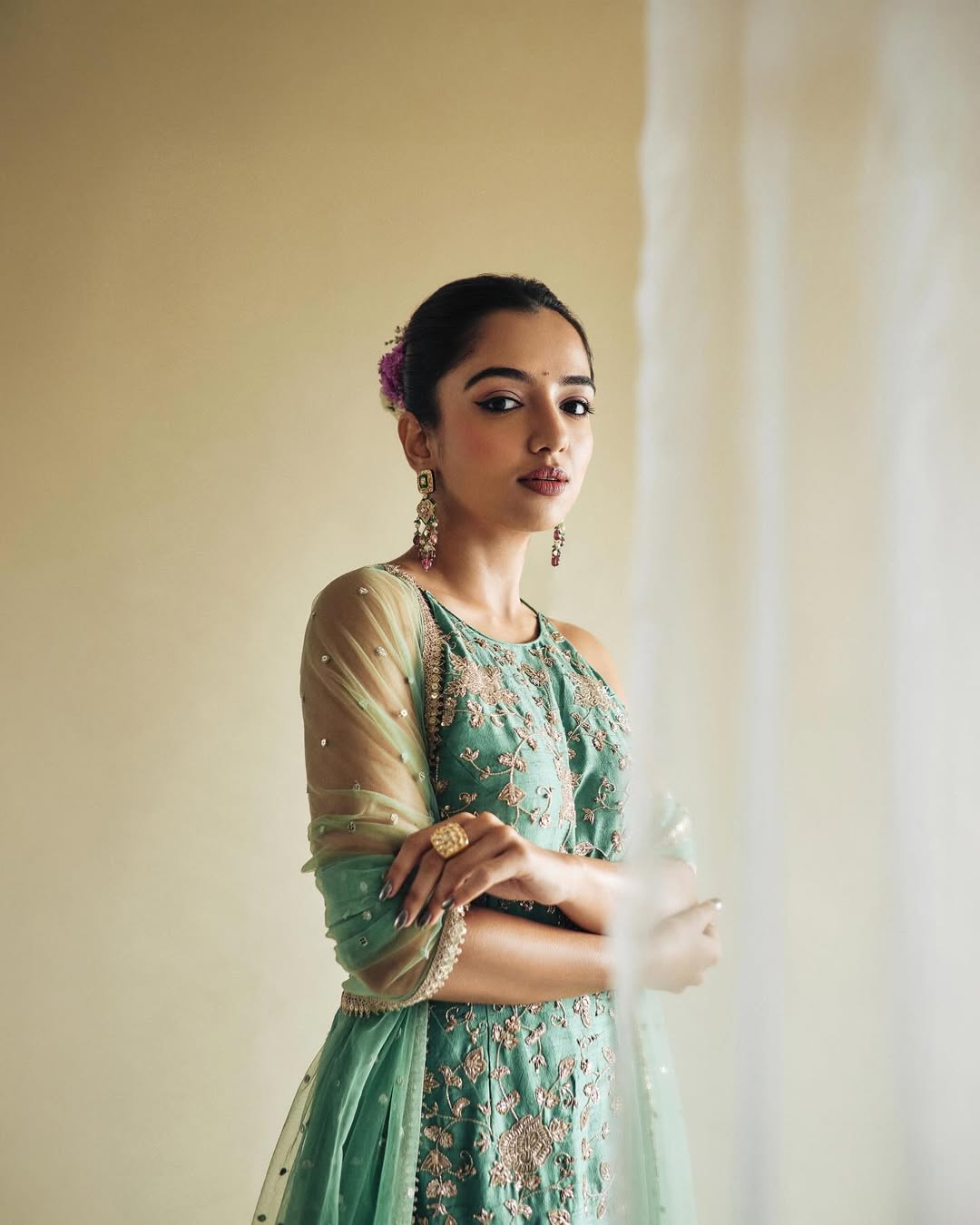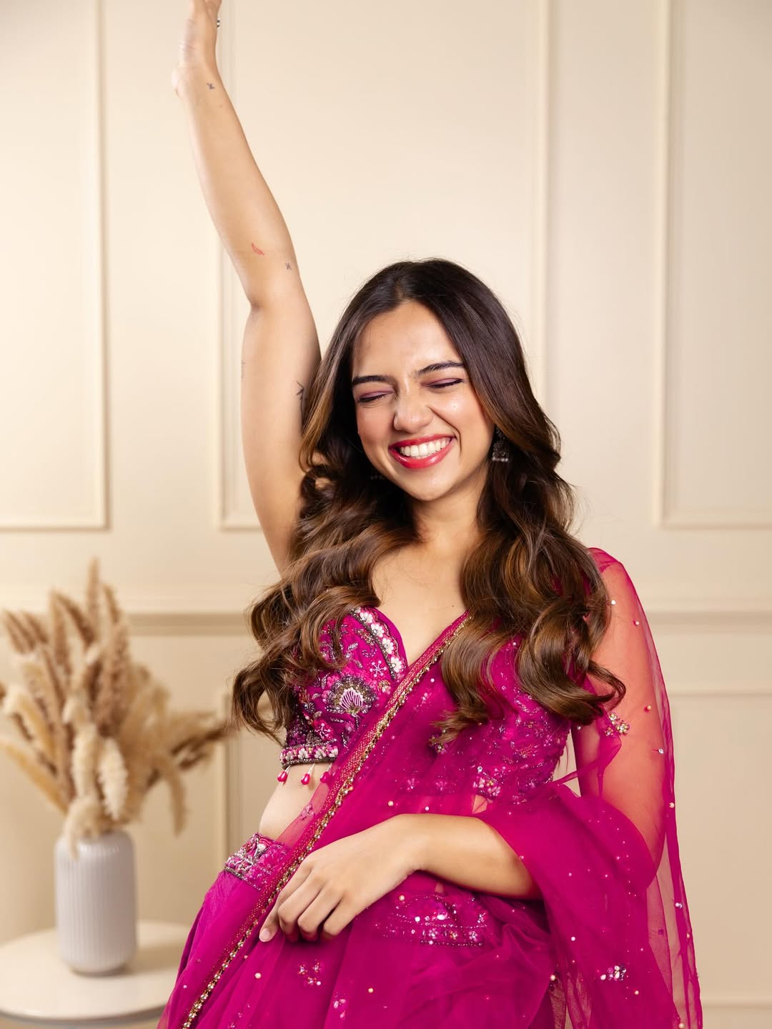 She looked ethereal in a stunning handcrafted saree from @gopivaiddesigns, perfectly paired with exquisite jewellery by @mrinalinichandra. Her subtle yet radiant makeup by @rakshandairanimakeupandhair complemented the elegant drape, enhancing her natural charm.