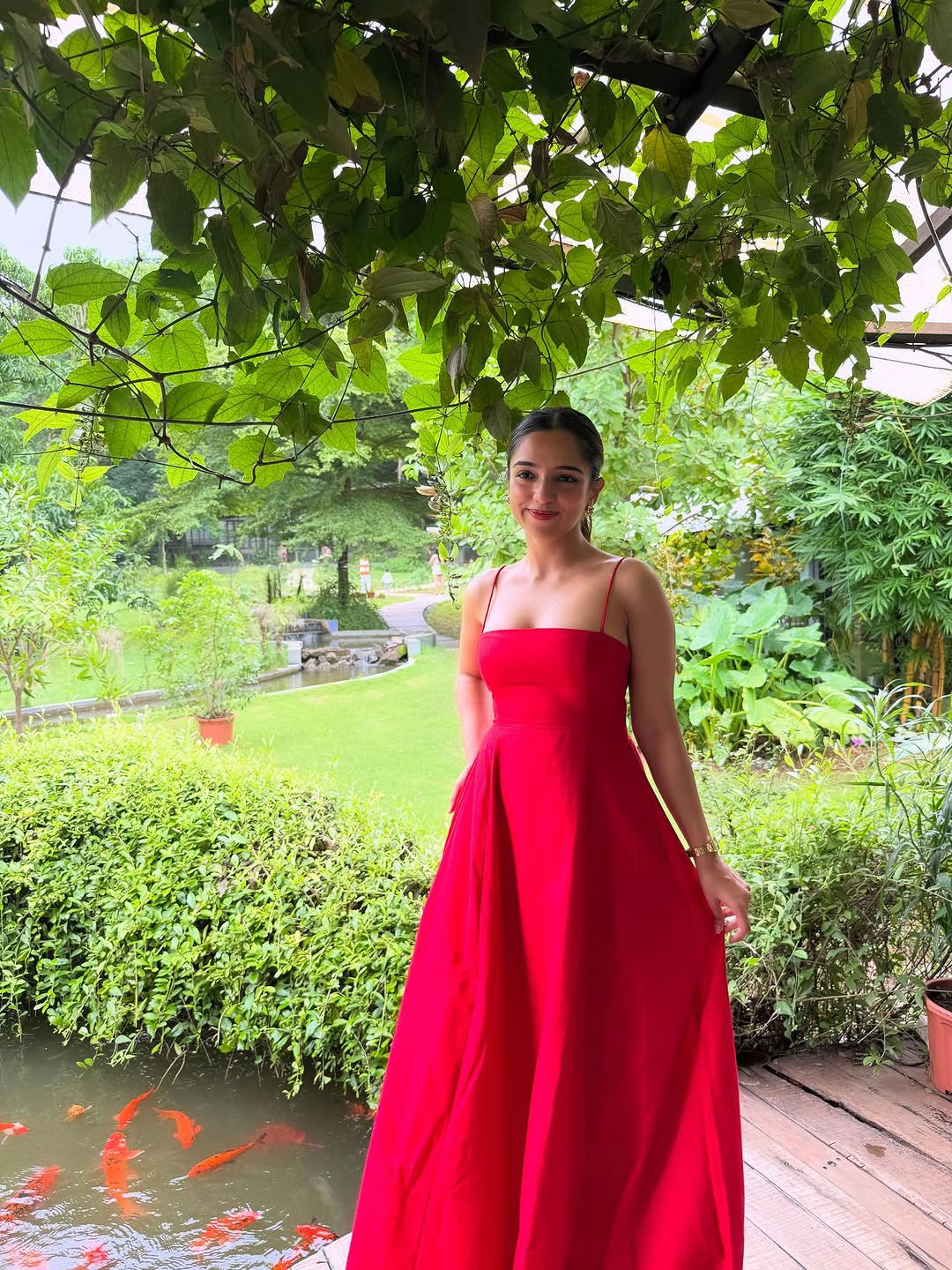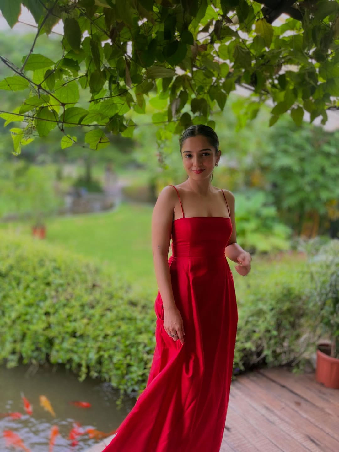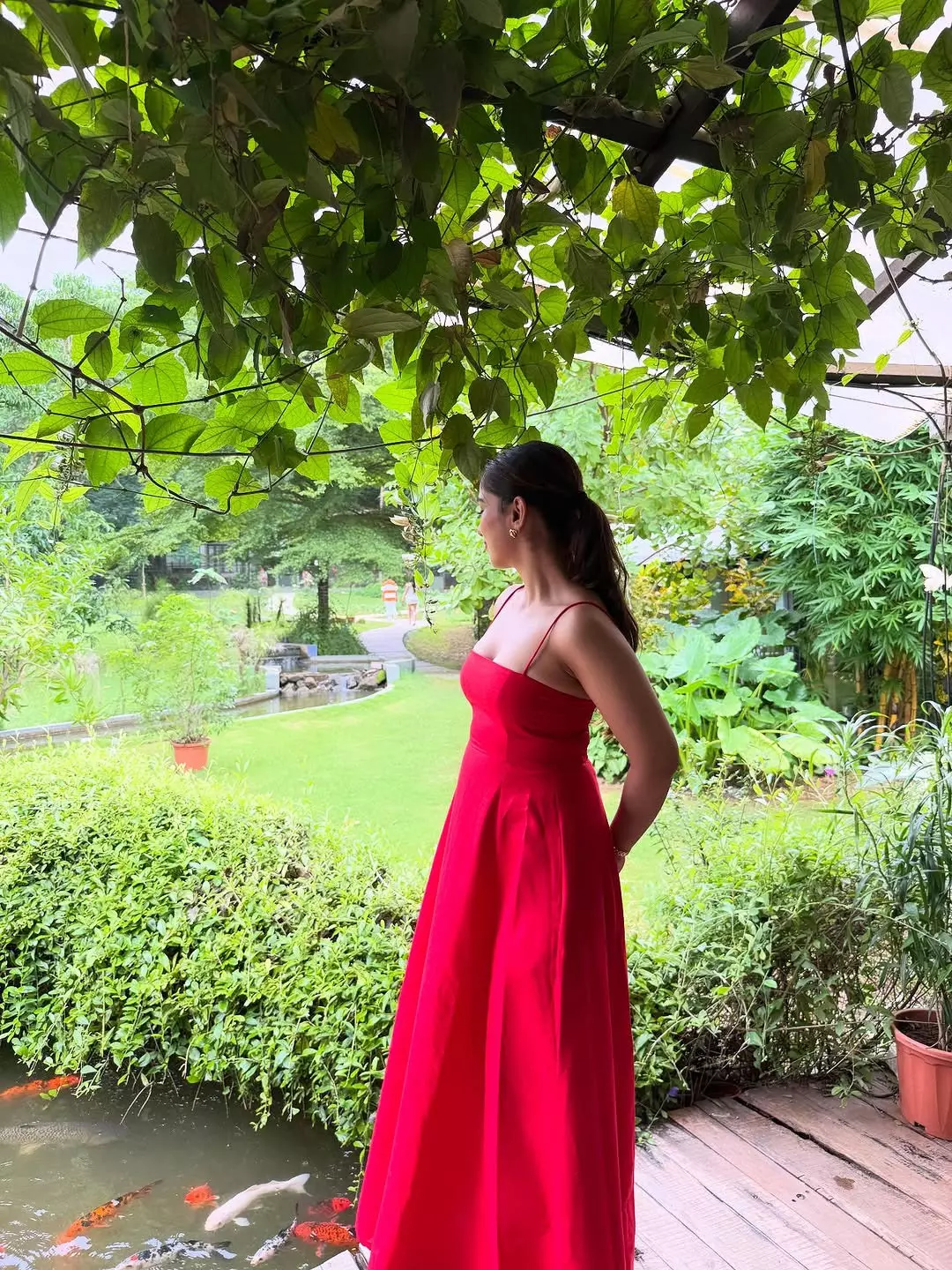 Ahsaas Channa shared a refreshing moment from her short vacation in Karjat with a new Instagram post that’s already drawing love from her fans. She is seen in a vibrant red dress standing beside a quiet koi pond surrounded by lush greenery. She captioned it, “A mini monsoon getaway begins ☔💙.”