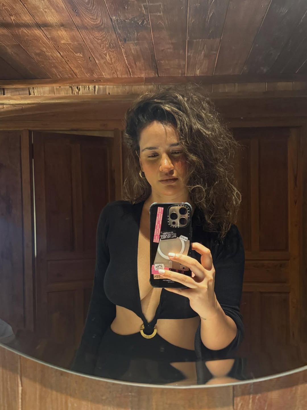 The dramatic neckline, classic black shade, and flowing design combine to create a look that exudes sophistication while maintaining a touch of daring glamour. Through this ensemble, Aisha showcases her ability to make bold fashion statements feel effortless, polished, and utterly captivating.