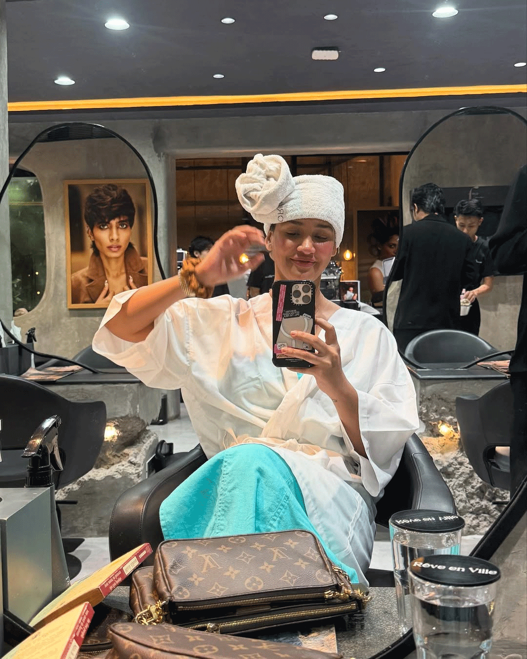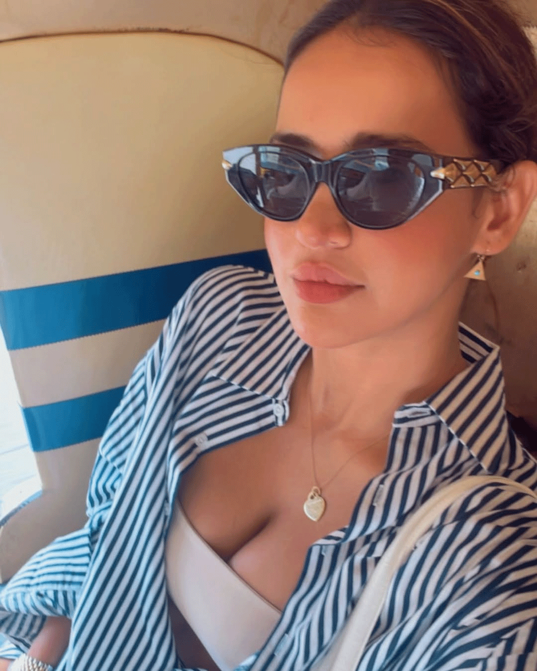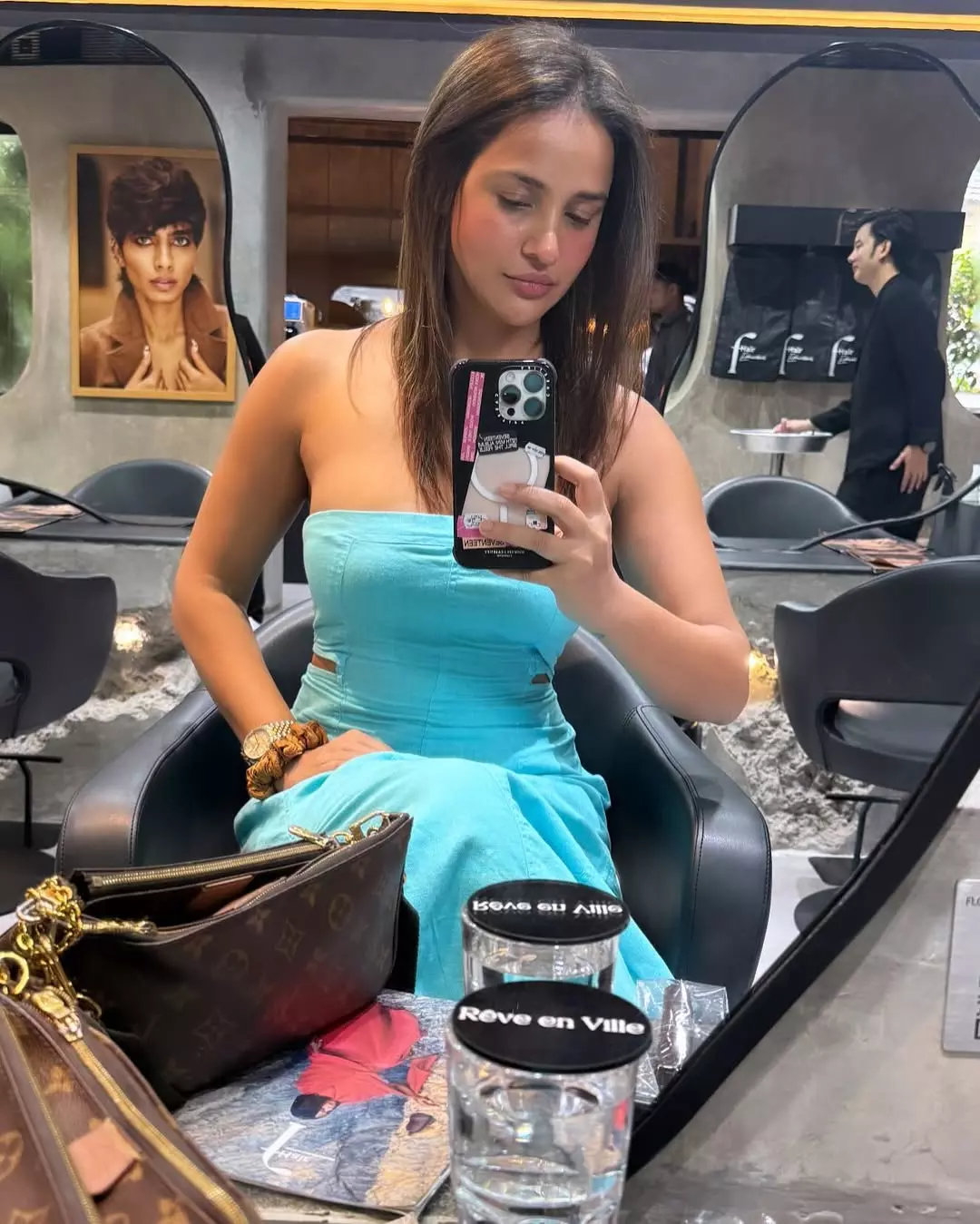 Actress and model Aisha Sharma recently shared an adorable photo on Instagram, where she’s seen sitting in a stylish salon, dressed in a vibrant turquoise dress. With a Louis Vuitton pouch on the table, a luxury lifestyle on display and her soft smile partially reflected in the mirror, Aisha once again proves her natural flair for fashion and self-expression.
