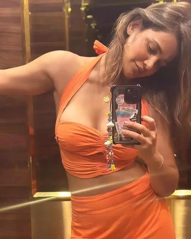 Another picture showed Aisha in a beige co-ord set. The top was decorated and stylish. She stood near a rustic doorway and looked like a vintage diva.