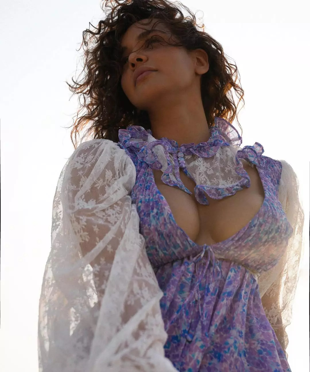Aisha Sharma stunned in a dreamy white eyelet co-ord set — sleeveless vest with delicate lace details over a blue bralette, paired with a flowy tiered skirt.