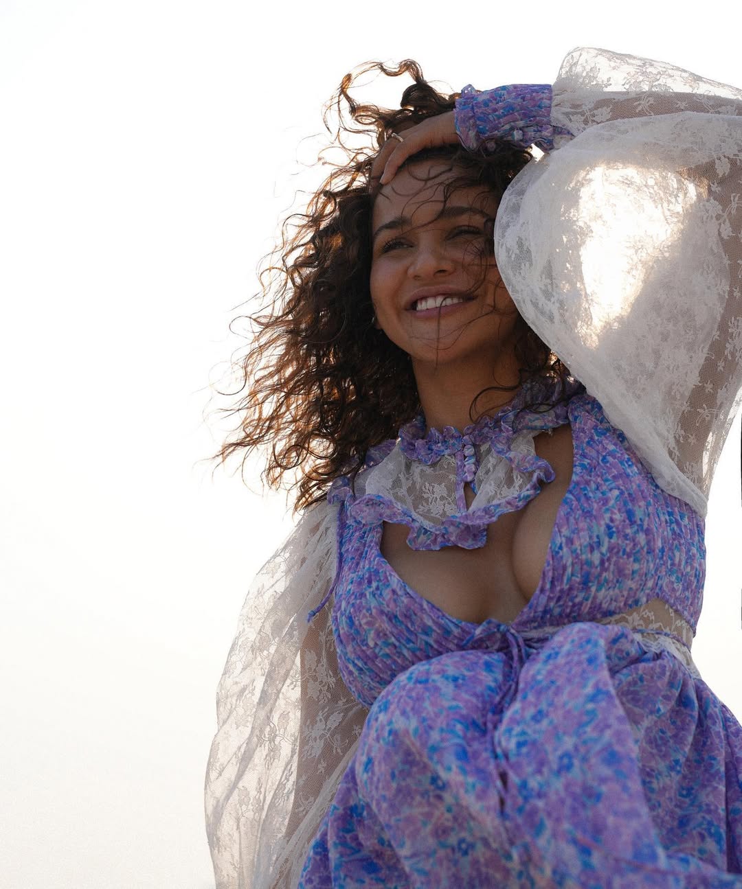 Aisha Sharma stunned in a dreamy white eyelet co-ord set — sleeveless vest with delicate lace details over a blue bralette, paired with a flowy tiered skirt. Captured in a mirror selfie, she exudes effortless summer chic with wavy hair, minimal jewellery, and that signature glow.