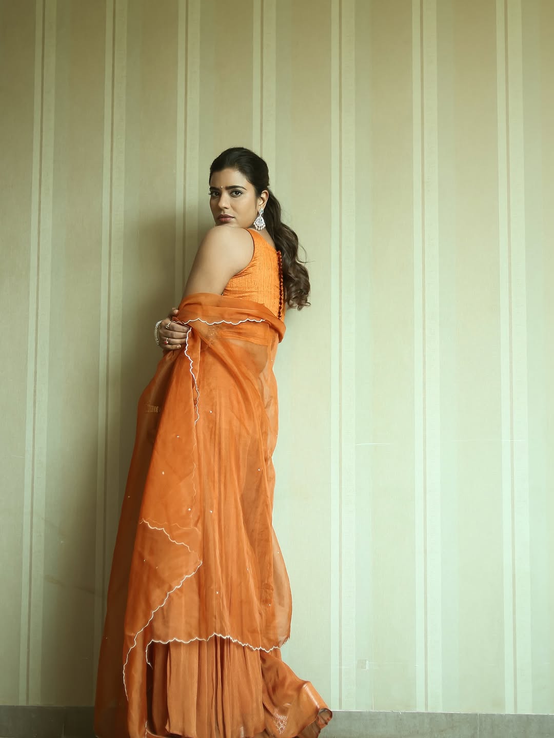 Wearing a stunning rust-orange ensemble by @anahitashelat, Aishwarya looked nothing short of regal. The sleeveless blouse featured intricate embroidery with divine motifs, adding cultural richness to the contemporary silhouette. The flared palazzo-style bottom and sheer dupatta gave the outfit movement and sophistication. Her styling was simple yet impactful accentuated with minimal jewelry, a wristwatch, and a soft glam look.