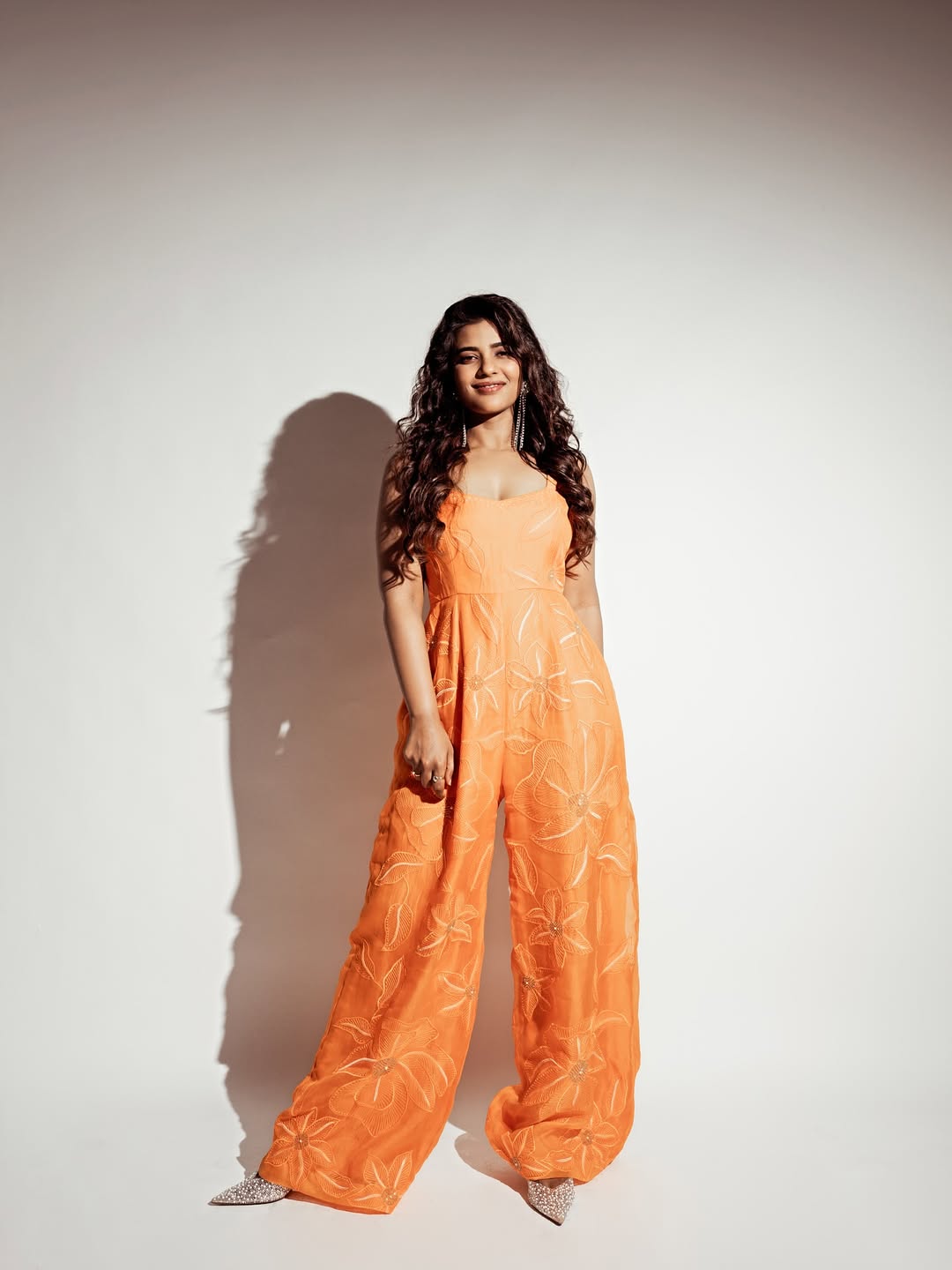 She was seen in a bright orange jumpsuit. The background was plain, which made her presence stand out even more.