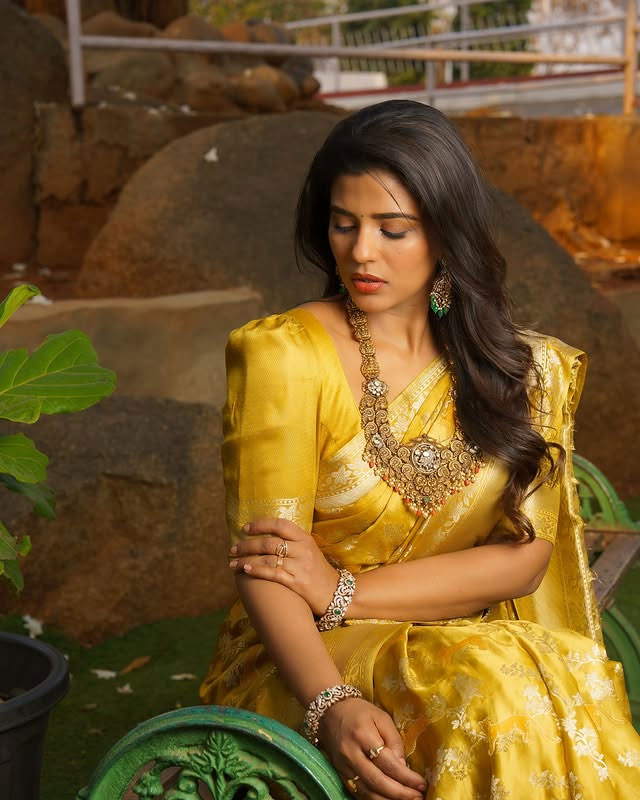 Her caption read: Be happy. Be Bright. Be You. She credited the team behind the look. Styling was done by soigne_official_. Her attire was from studio24_bespoke. Photography was by sat_na and shared on shotsbyuv. The bracelet was from aadiraabyaarushi. The retouch work was by retouch_by_abimanyu. Makeup was done by ananthmakeup. Hairstyle was managed by hairstylistkumar.