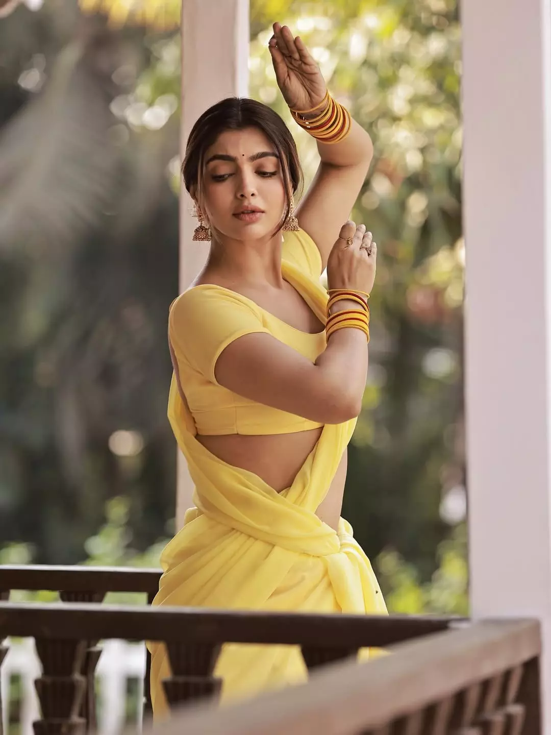 In a recent photoshoot captured by Amit Khanna, she glows effortlessly in a sunlit yellow saree, her natural radiance enhanced by minimal styling