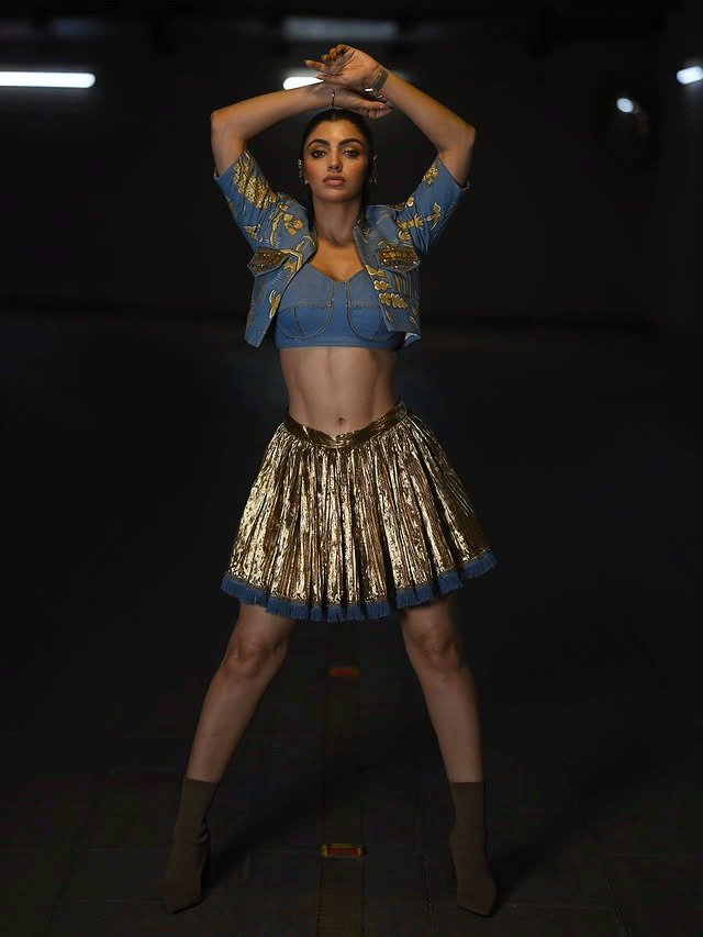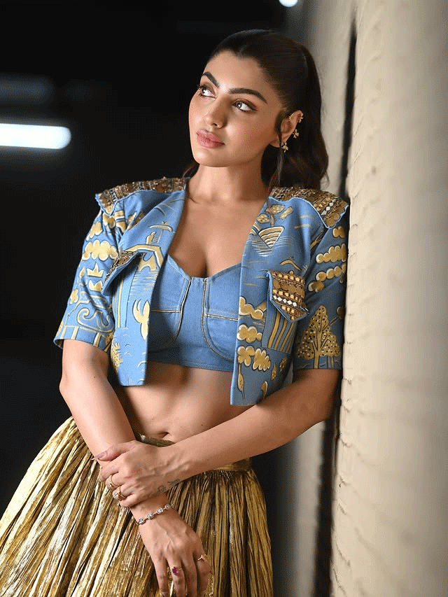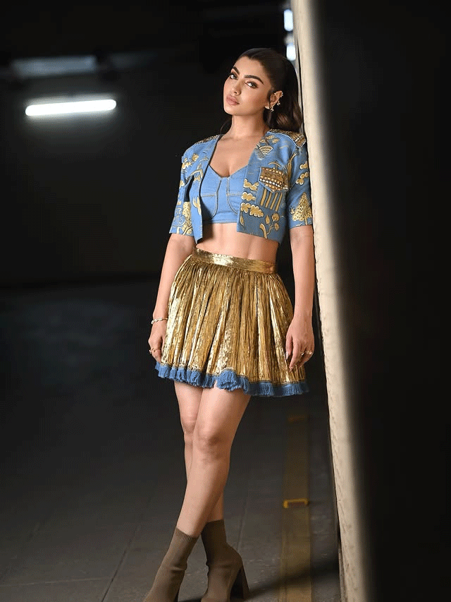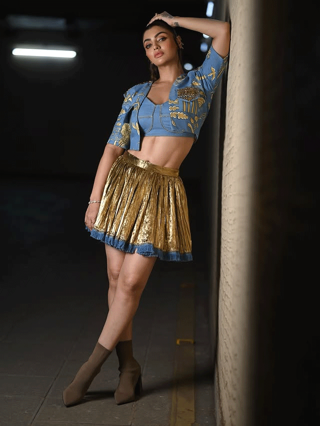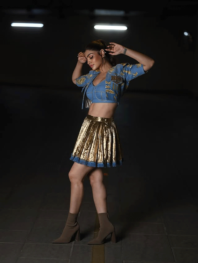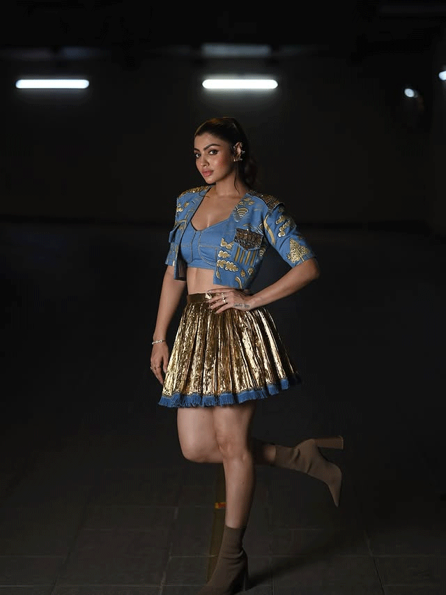 By: Tupaki Desk | 9 Jun 2025 11:53 AM ISTAkanksha Puri shared a new look on Instagram and instantly got people talking. She is seen wearing a shiny gold pleated skirt paired with a structured blue top and jacket. Her caption read, “Stealing the spotlight 🔥”, and that’s exactly what she did. The entire team behind her look was tagged with credits—photography by @lsd.photography.official, clothes by @ashnavaswaniofficial, styling by @styleitupwithraavi, jewellery from @the-_jewel-_gallery, hair by @salmasayyed47 and makeup done by Akanksha herself.