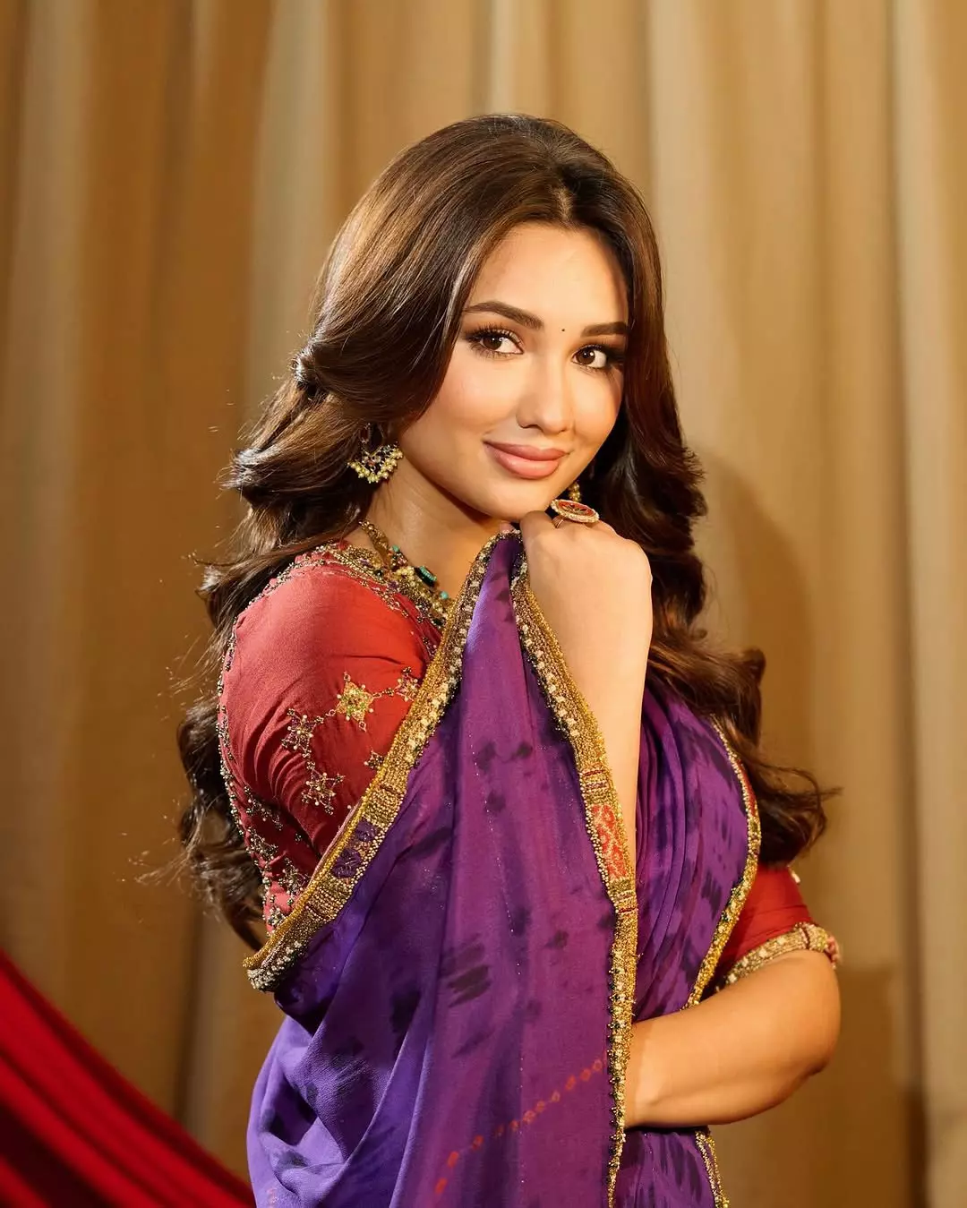 The saree features hand-painted floral designs, and her pink blouse adds a feminine touch. Akanksha’s soft waves and glowing makeup complete the graceful appearance. The overall aesthetic of the look captured perfectly by photographer Amanna Goshe feels classy and timeless.