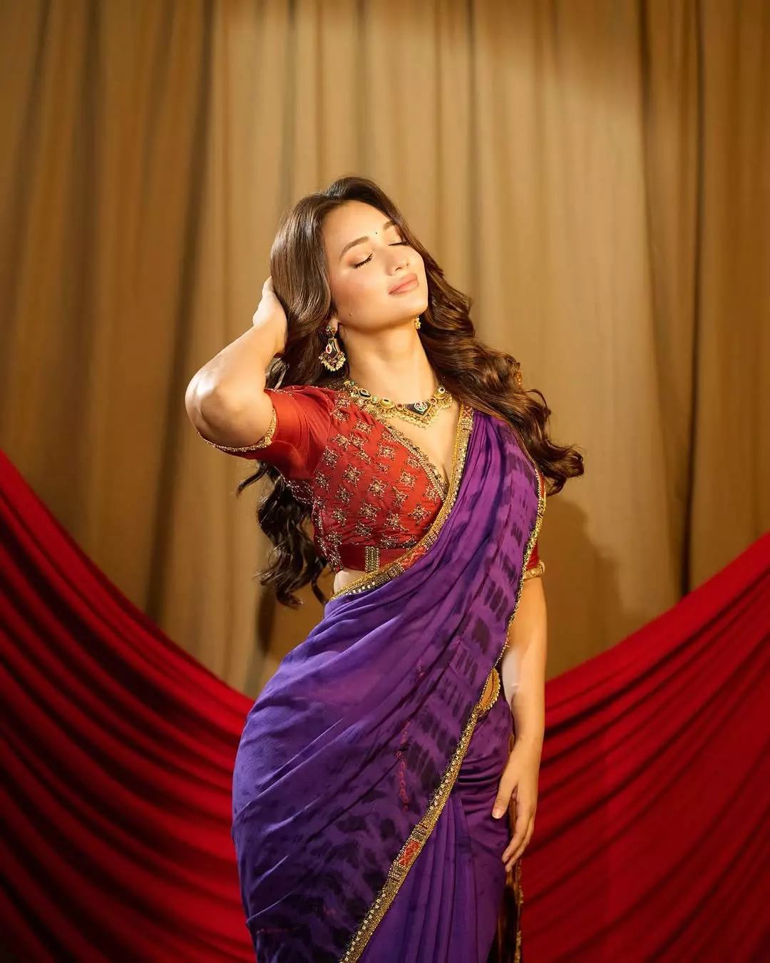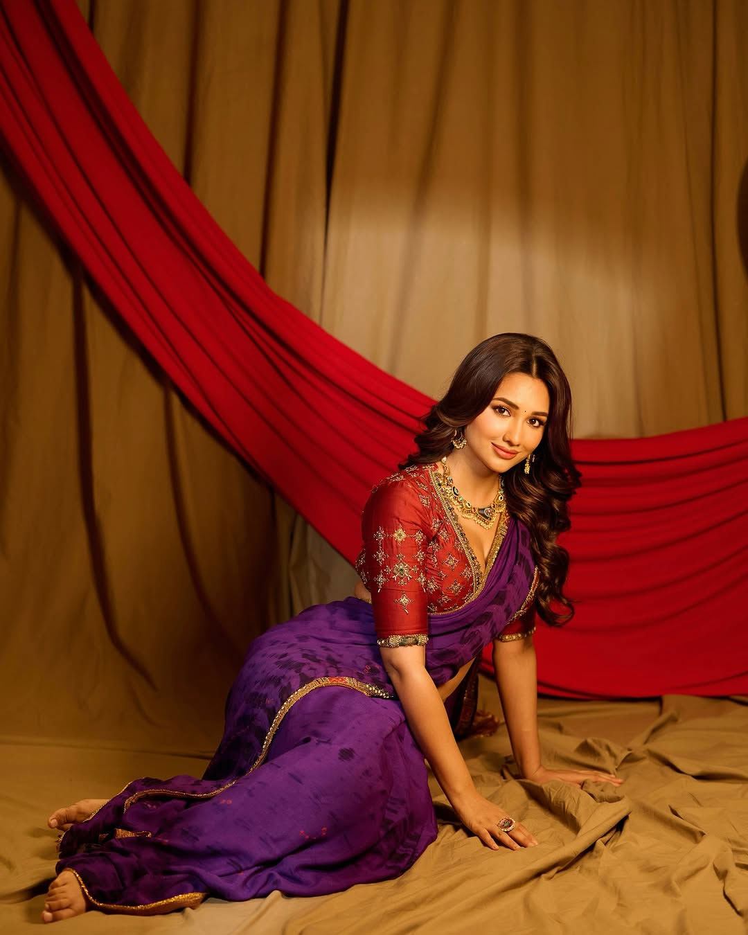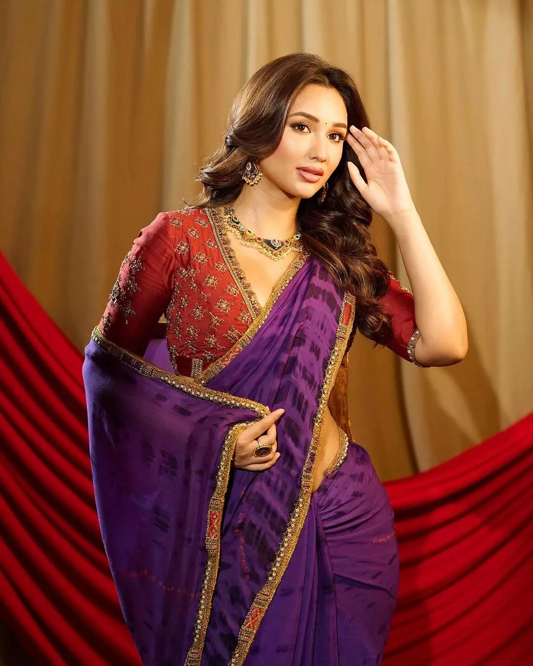 She is seen in a purple saree with gold detailing paired with a heavily embroidered red blouse.