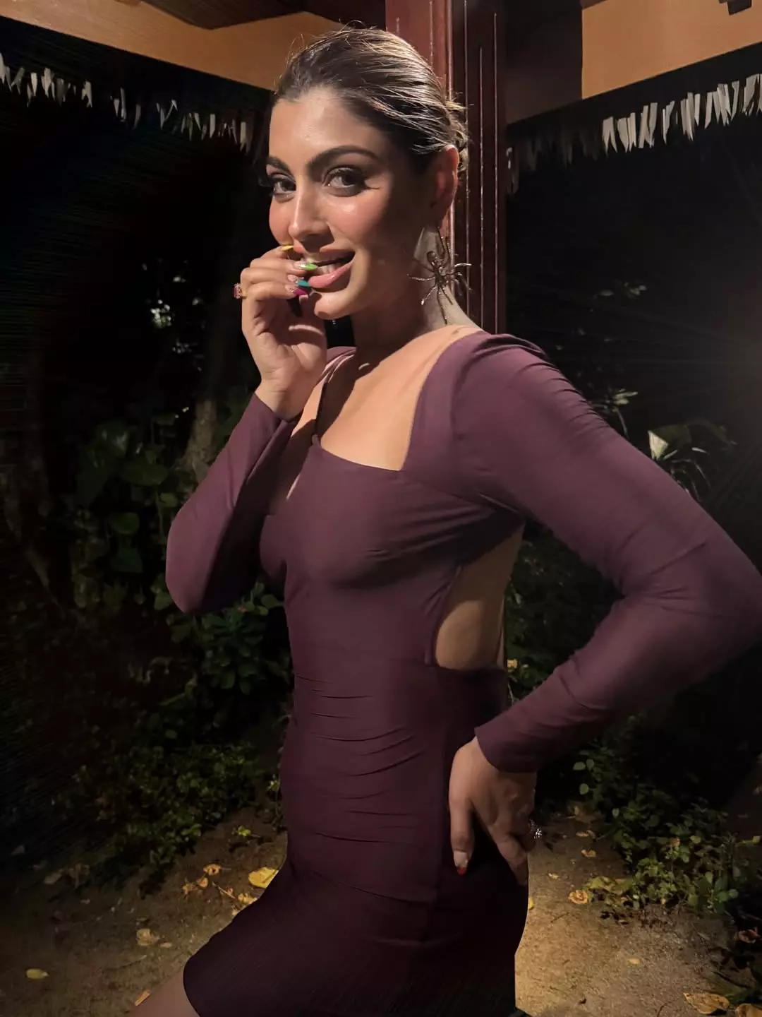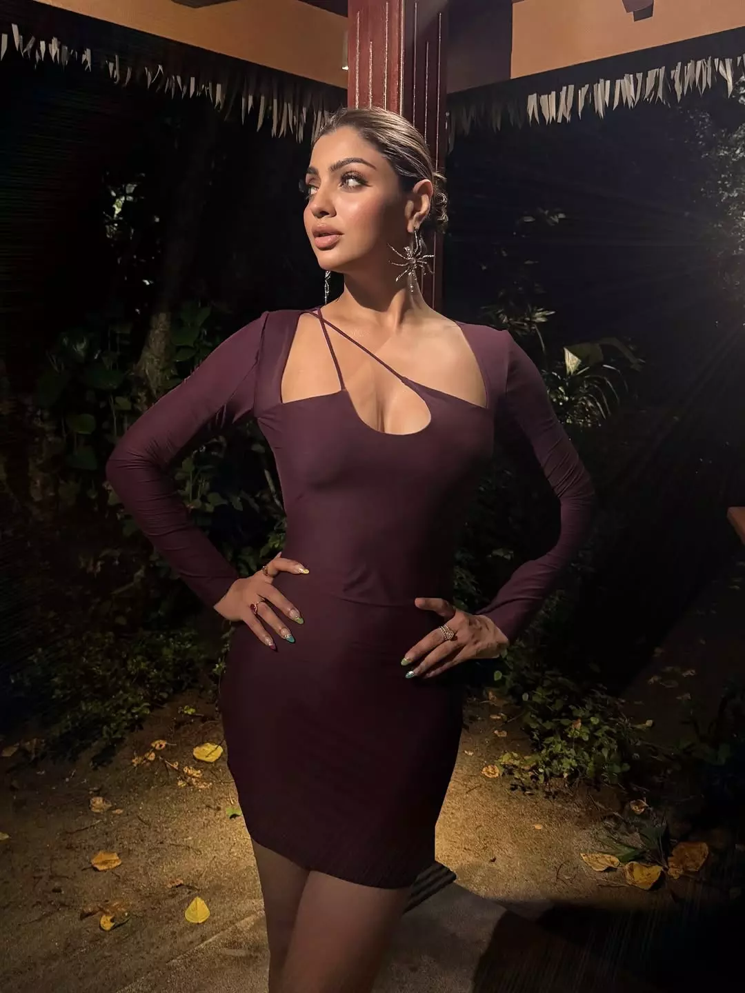 Actress Akanksha Puri exudes sophistication and confidence in her latest look. Dressed in a deep wine-hued bodycon outfit with a chic cutout design, she strikes the perfect balance between bold and elegant. The sleek silhouette highlights her grace, while her statement earrings and subtle glam makeup add a touch of luxury. With her poised presence and captivating style, Akanksha once again proves why she is considered a fashion inspiration for many.