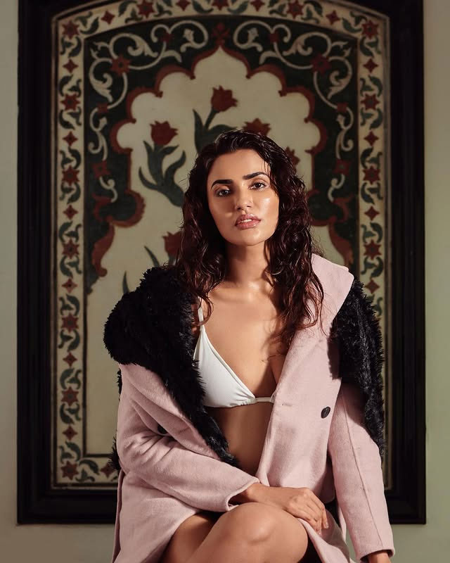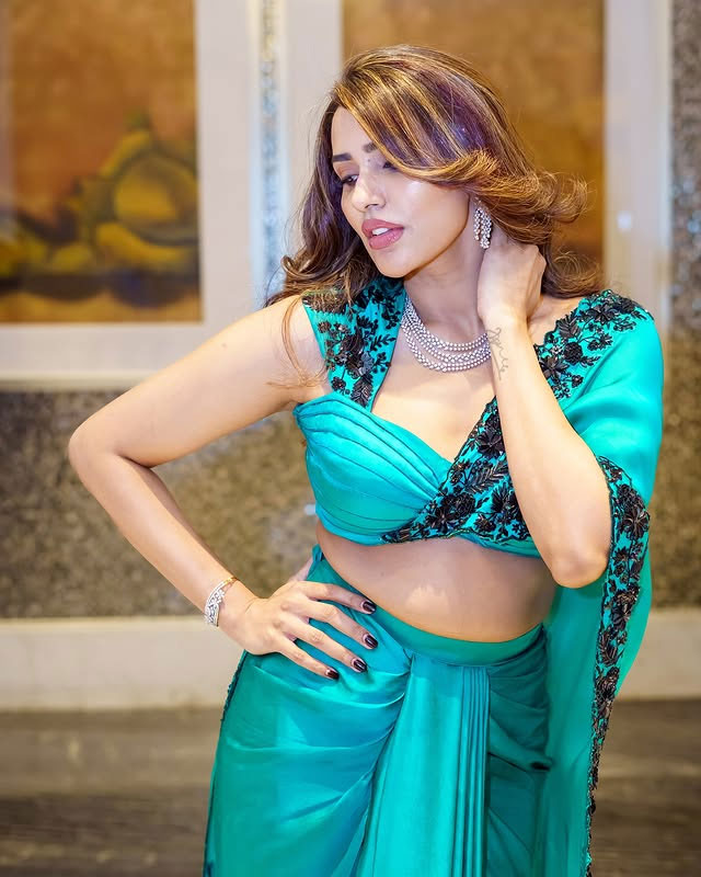 In a striking new studio photoshoot, Akshara Gowda exudes confidence and sensuality as she poses with both arms raised, wearing a bold black cut-out bodysuit featuring a sequined bralette, mesh cut-outs, and fishnet stockings. Her wavy hair frames her face while she delivers a sultry pout, perfectly showcasing her glamorous and daring style.