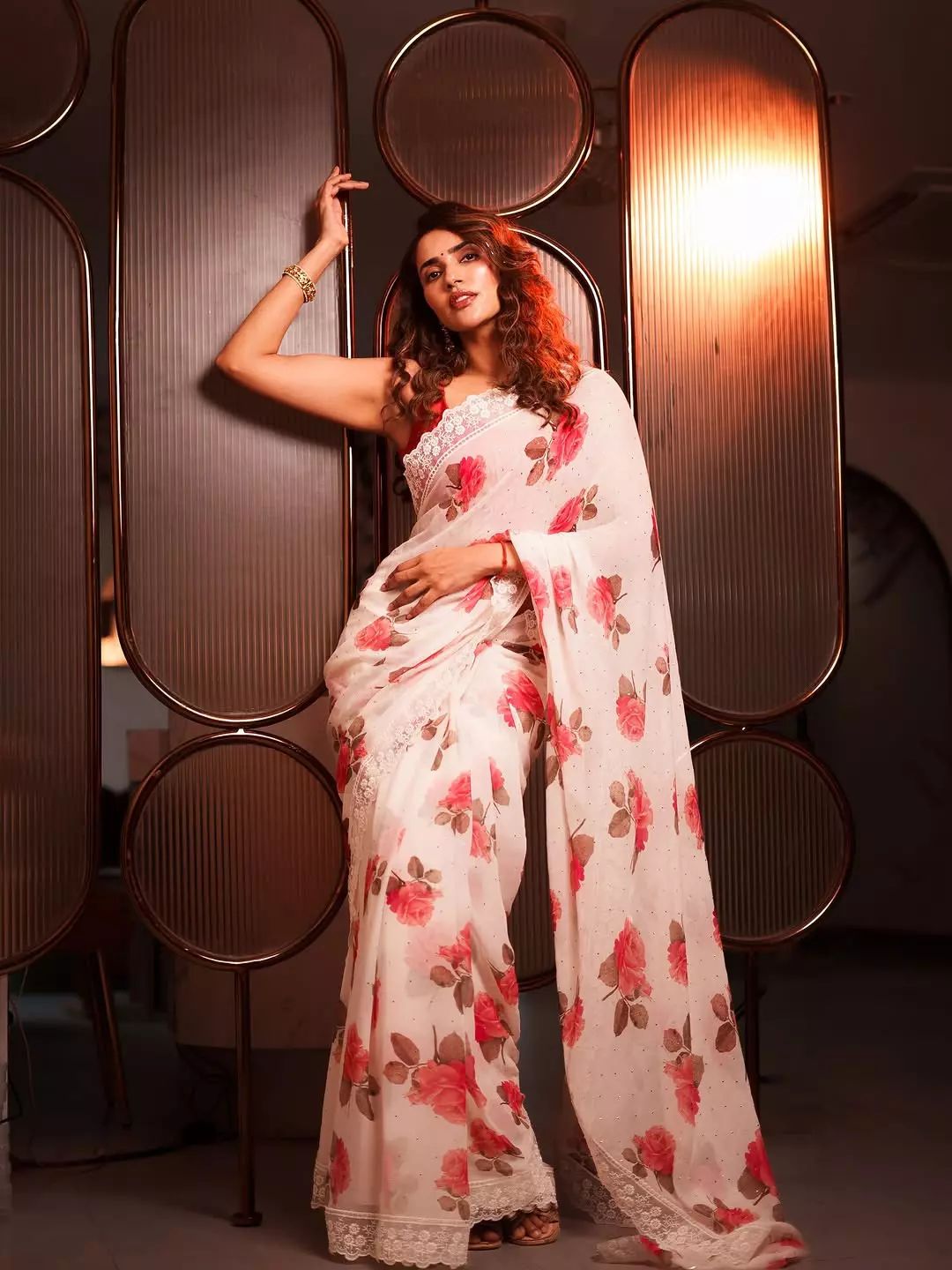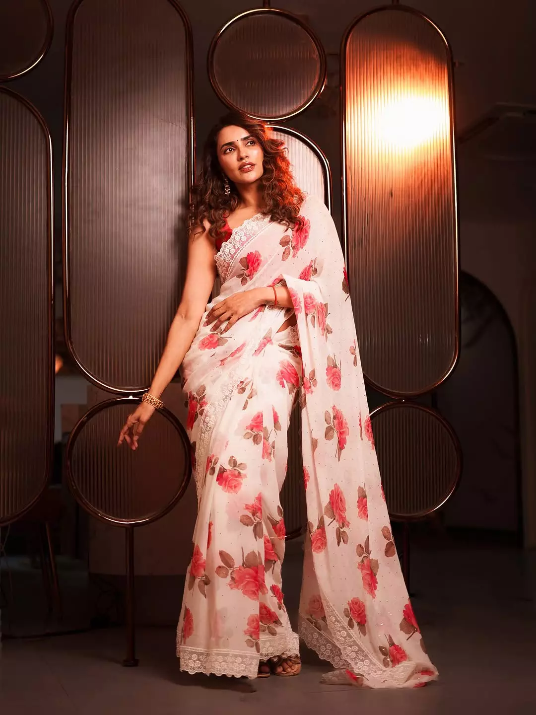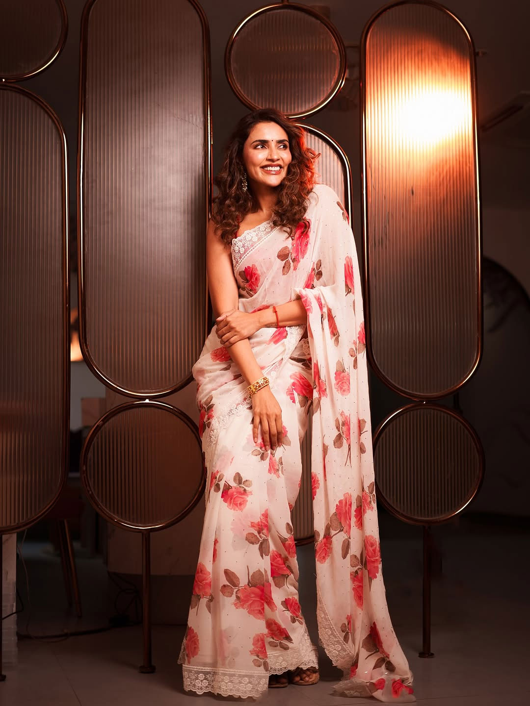 The actress looked gorgeous in a white saree with pink floral prints, paired with a stylish blouse. Her traditional look was completed with soft curls and minimal accessories by reflecting grace and charm. The outfit was styled by Deepti Alapati, while the saree and blouse were from Rajini Sarees and By Bhuvana. Makeup and draping were done by Avoca India, and the photo was clicked by Focus Clix.