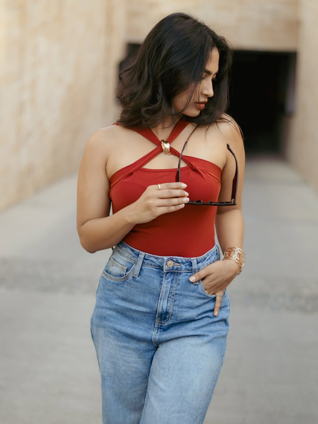 Her latest photoshoot is creating waves on social media, and the caption “Kannepettaro Kannu Kottaro 😉 Comment the most Swag photo 😎” perfectly captures the mood. Dressed in a bold red top paired with denim, Alekhya exudes casual chic while maintaining her signature elegance. The candid pose and stylish attitude reflect her evolving fashion sense and growing popularity as a trendsetter.