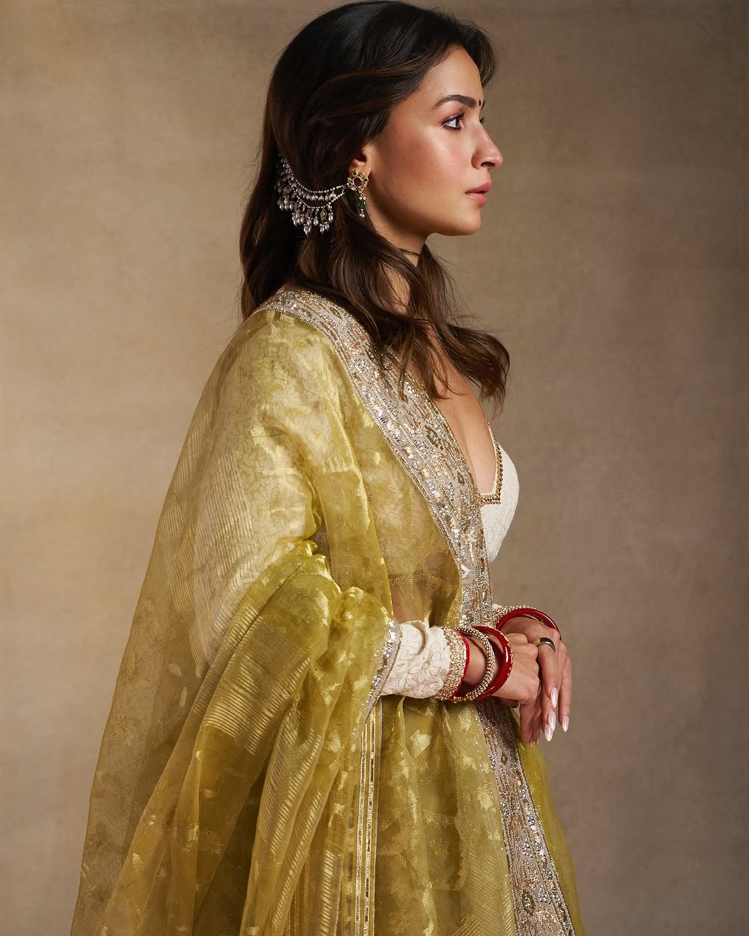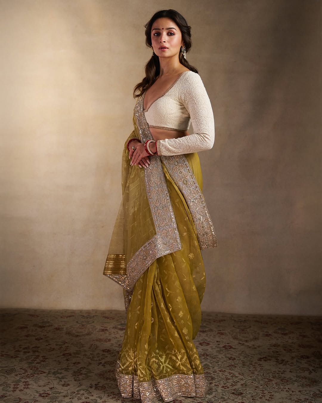 In ivory silks, she glows. In deep reds, she commands. Whether it’s a Sabyasachi saree or a simple handloom drape, Alia wears tradition not as costume, but as continuum—a living thread of culture, modernity, and self-expression.