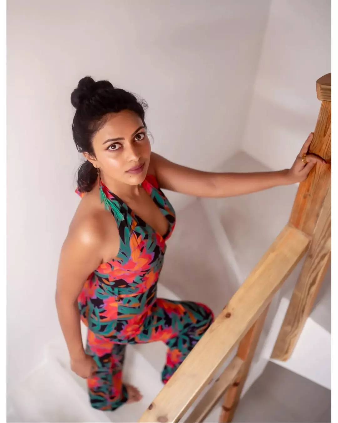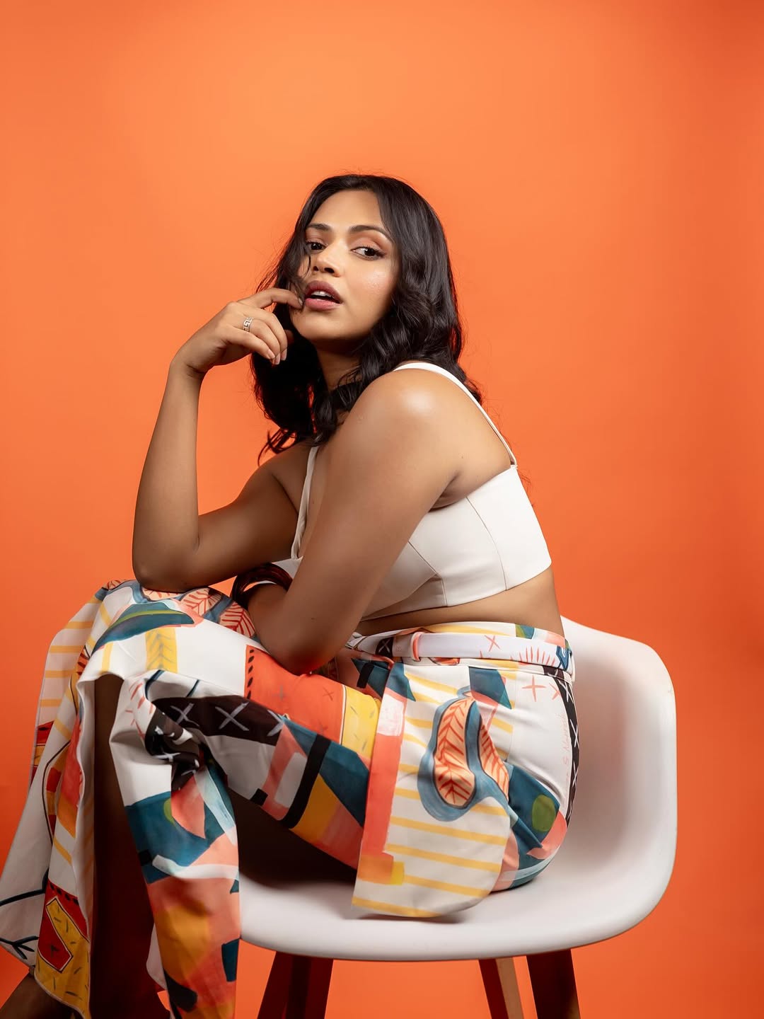 Amala Paul turns heads once again with her fierce fashion statement, blending bold style and unshakable confidence. Dressed in a white fitted crop top and ultra-vibrant, wide-legged pants featuring eclectic, hand-drawn patterns, Amala channels playful energy and artistic expression. The rich colors against the solid orange backdrop amplify her aura — effortlessly stylish, fiercely independent, and deeply expressive. Her soft waves, dewy makeup, and minimal jewelry let her attitude do the talking.