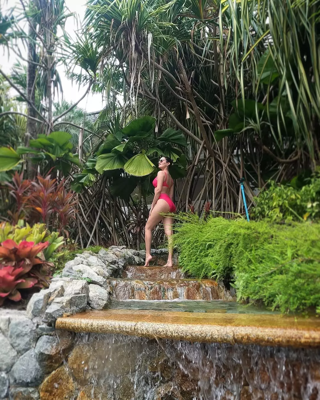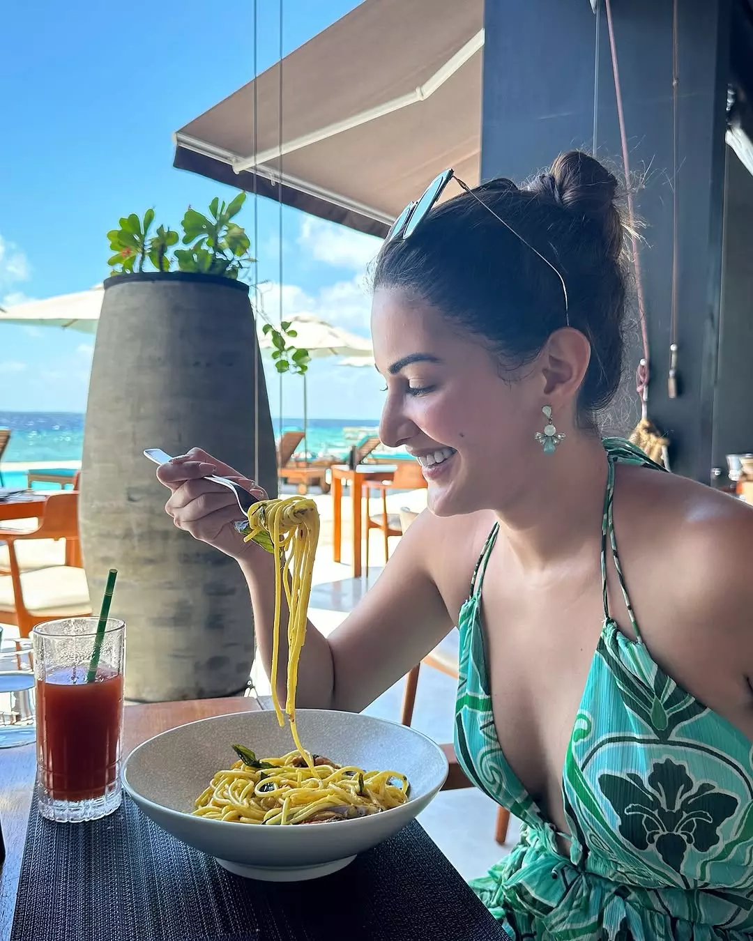 The stunning photo of Amyra Dastur radiates vibrant energy and elegance: Colour therapy anyone? She poses gracefully against a lush tropical backdrop with blooming trees and warm sunlight, her long brown hair flowing dramatically in the wind.