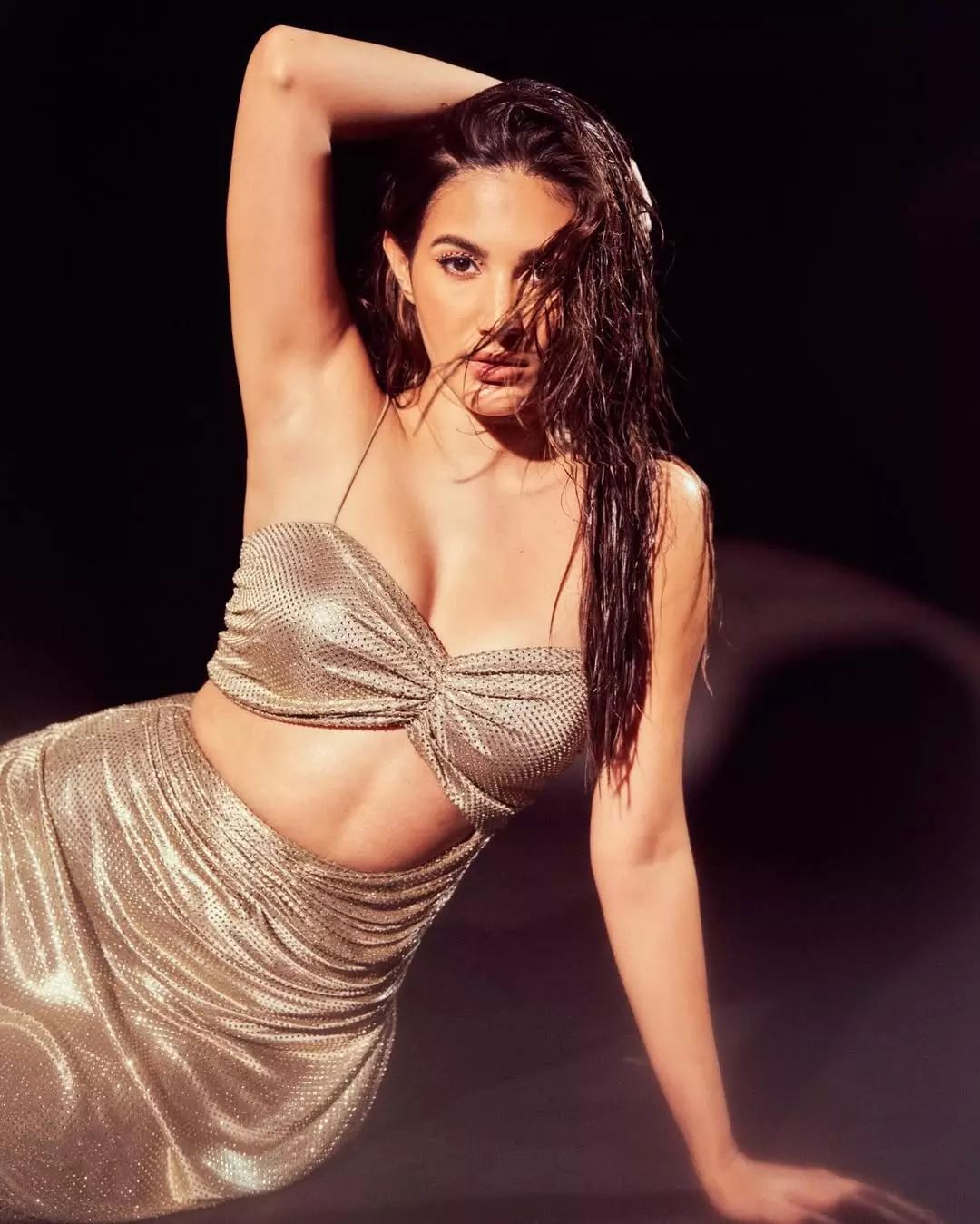 Her damp, tousled hair adds a raw, contemporary edge, while her luminous skin and softly defined makeup enhance her natural beauty. Amyra’s intense gaze anchors the composition, pulling the viewer in with quiet authority and poise. The mood is cinematic, intimate, and powerful—an embodiment of modern glamour.