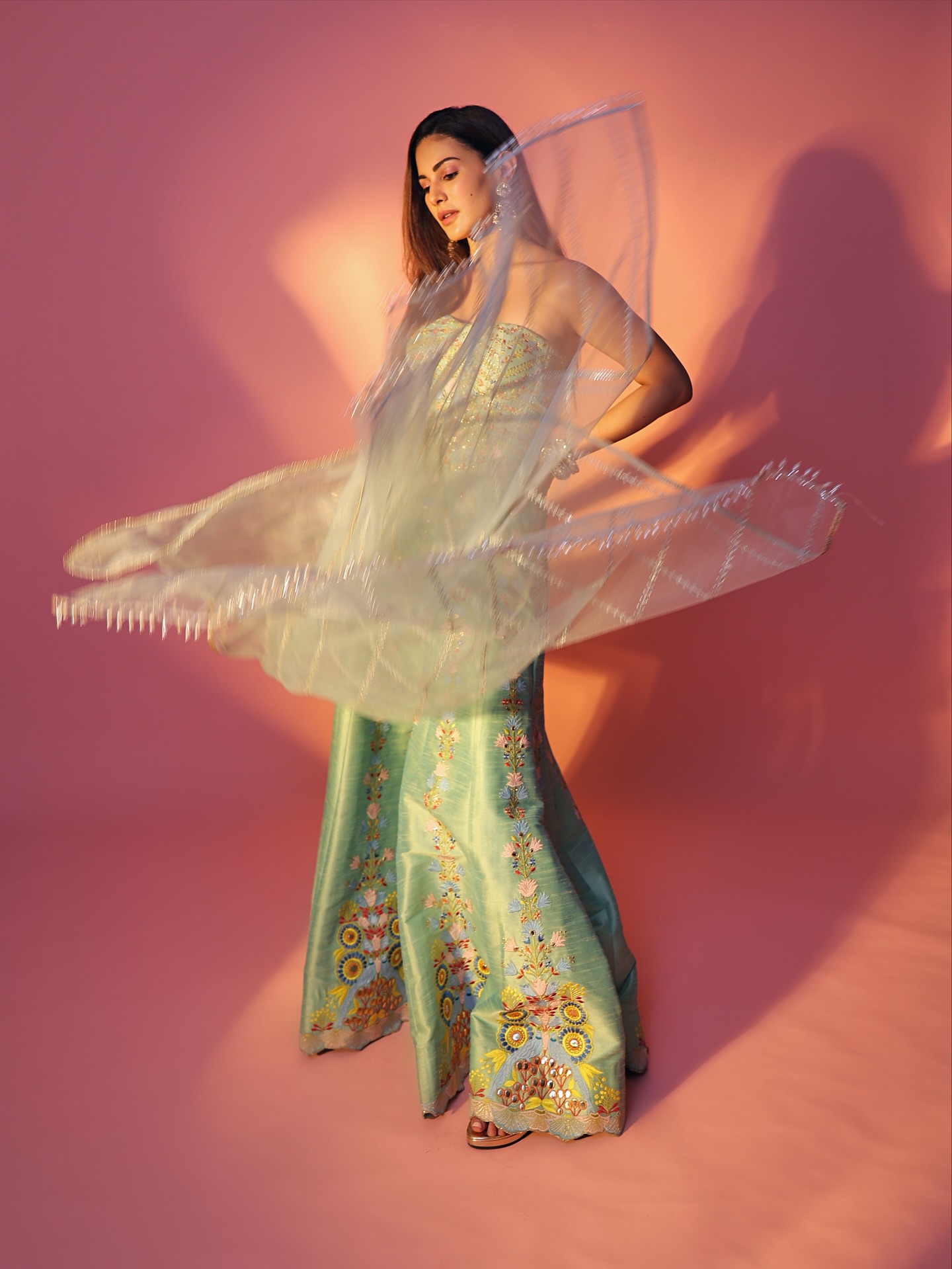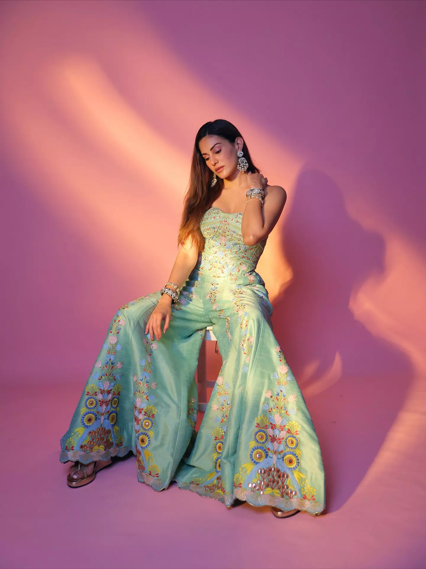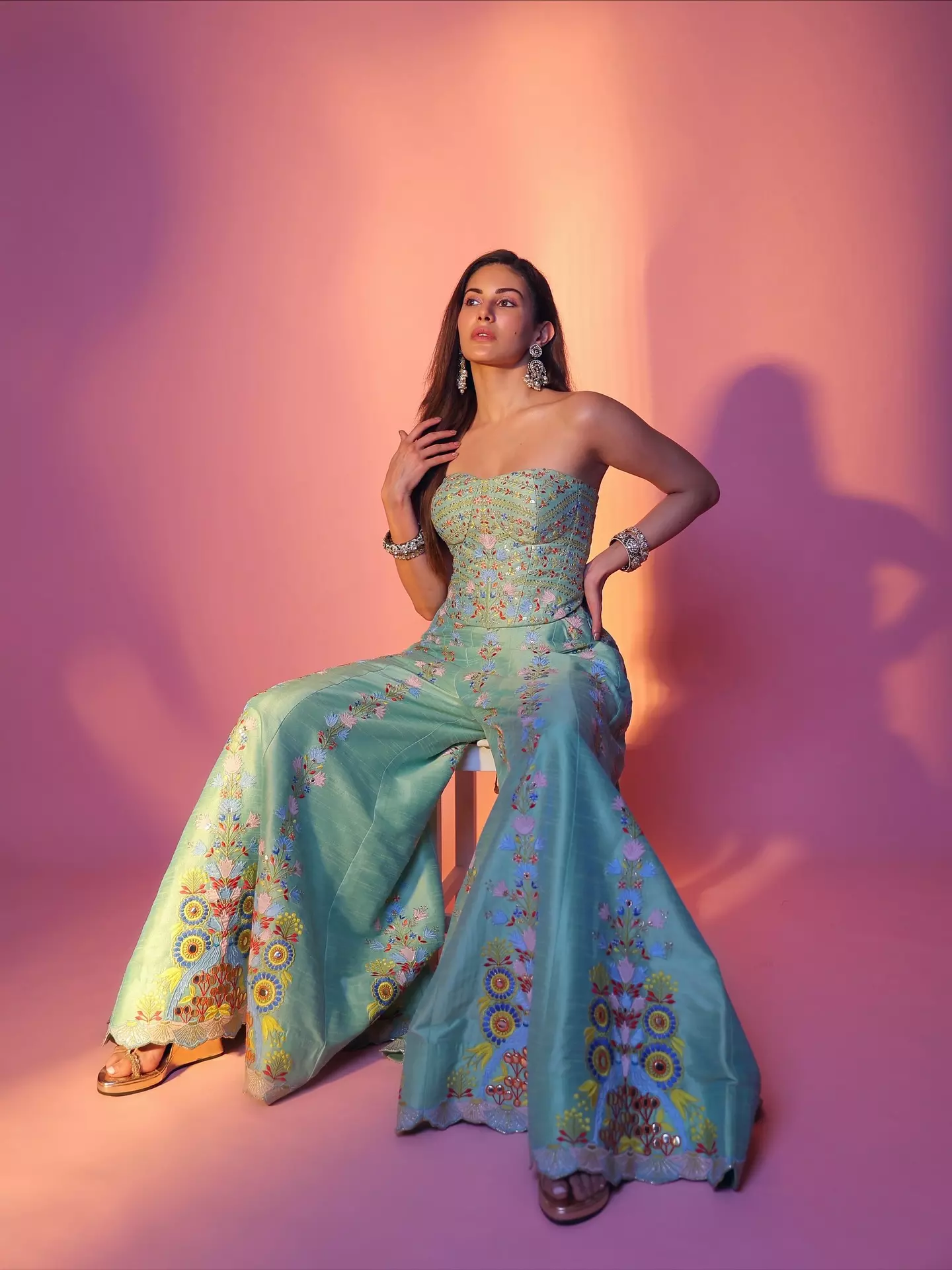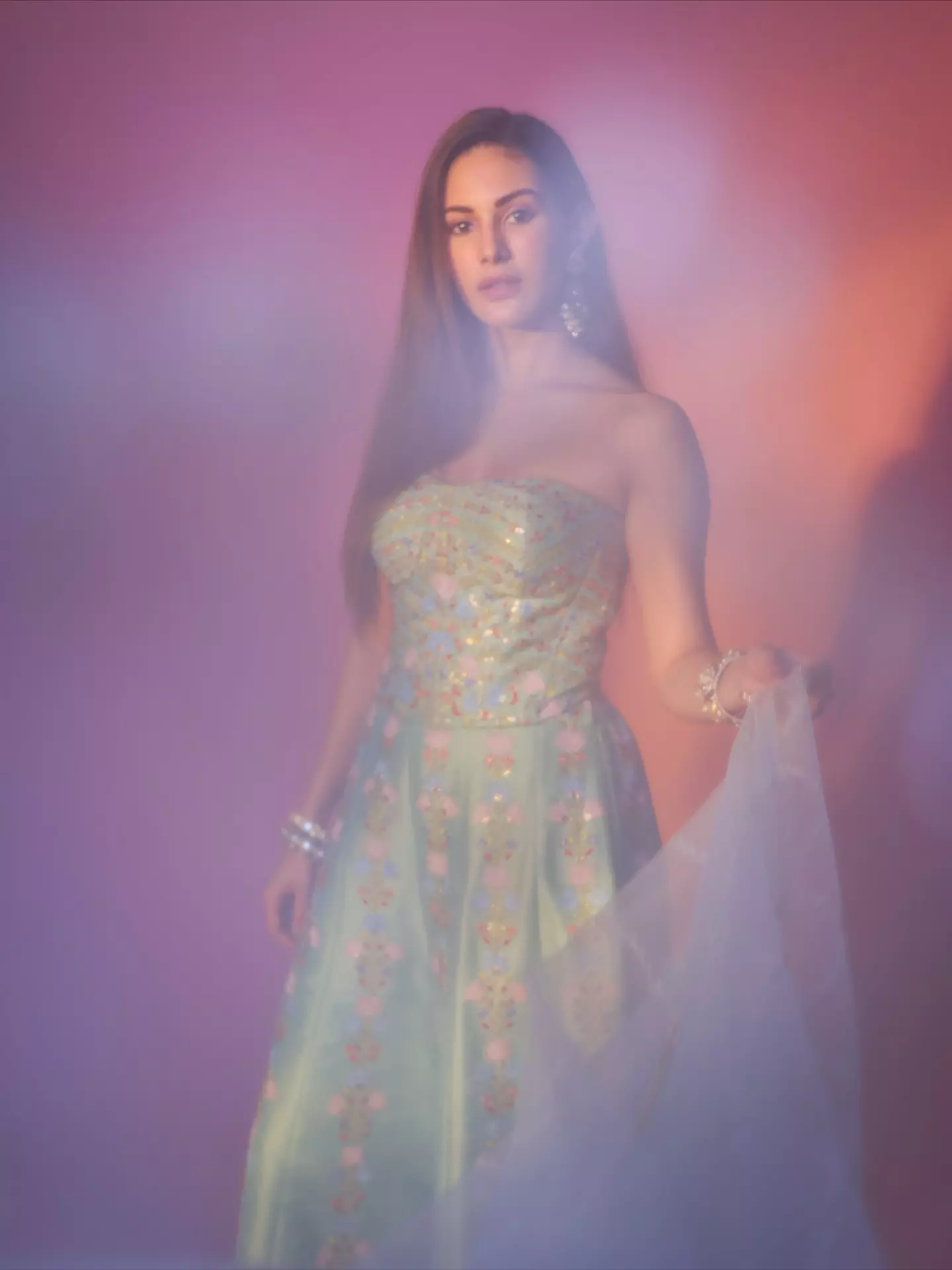 Amyra was seen wearing a pastel green strapless jumpsuit designed by Chamee and Palak.