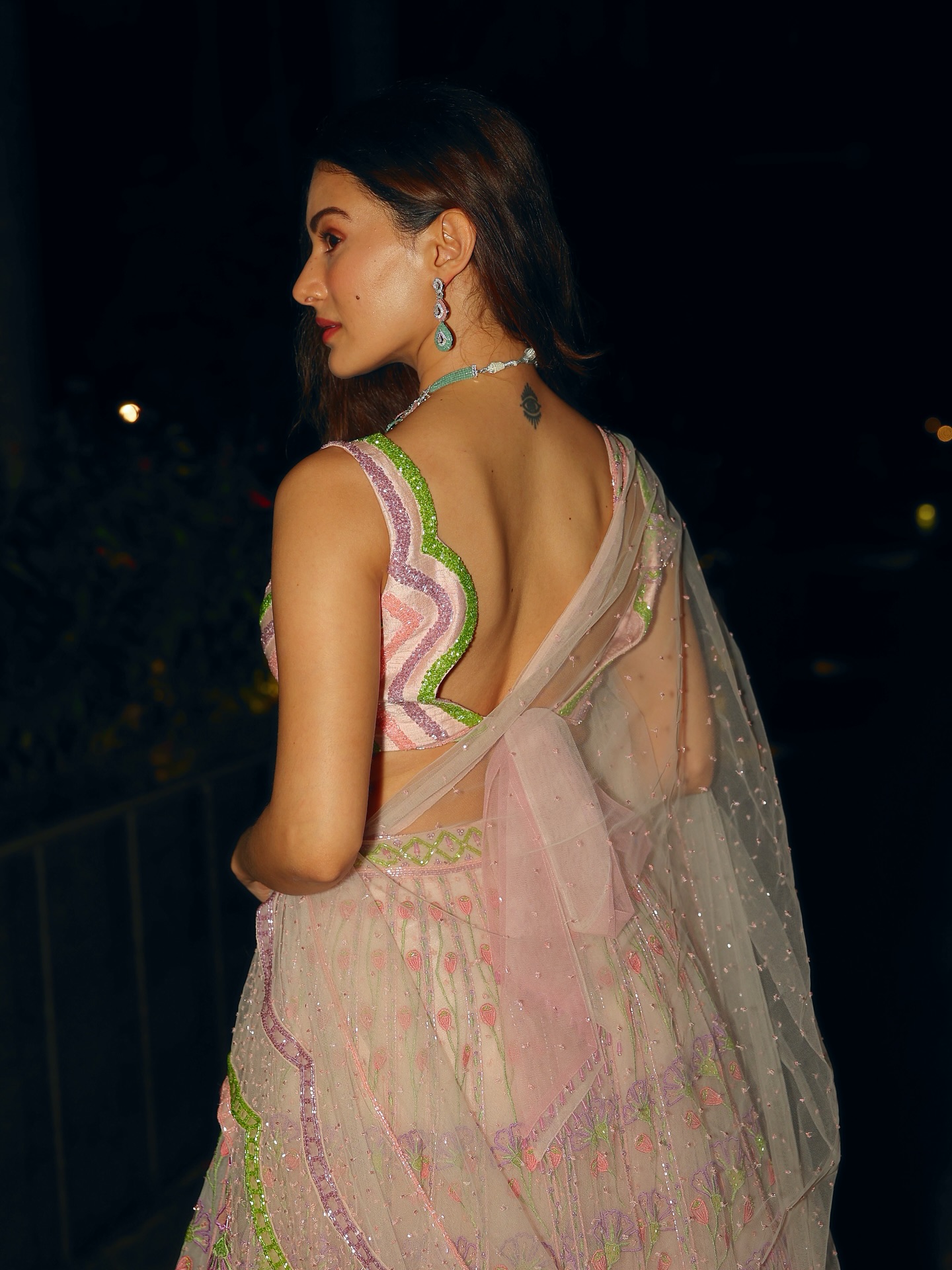 Her jewellery designed by House of Shikha, added the perfect touch of sparkle. The statement earrings and bangles complemented the soft tones of her dress without overpowering them. The overall look was styled by Richa Mehta who ensured every element blended seamlessly from the choice of accessories to the natural yet radiant makeup. The picture was beautifully shot by Portrait Shelter.