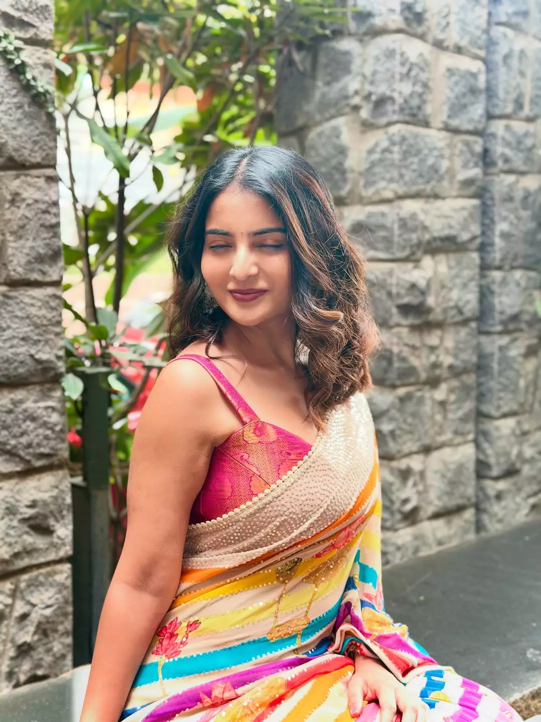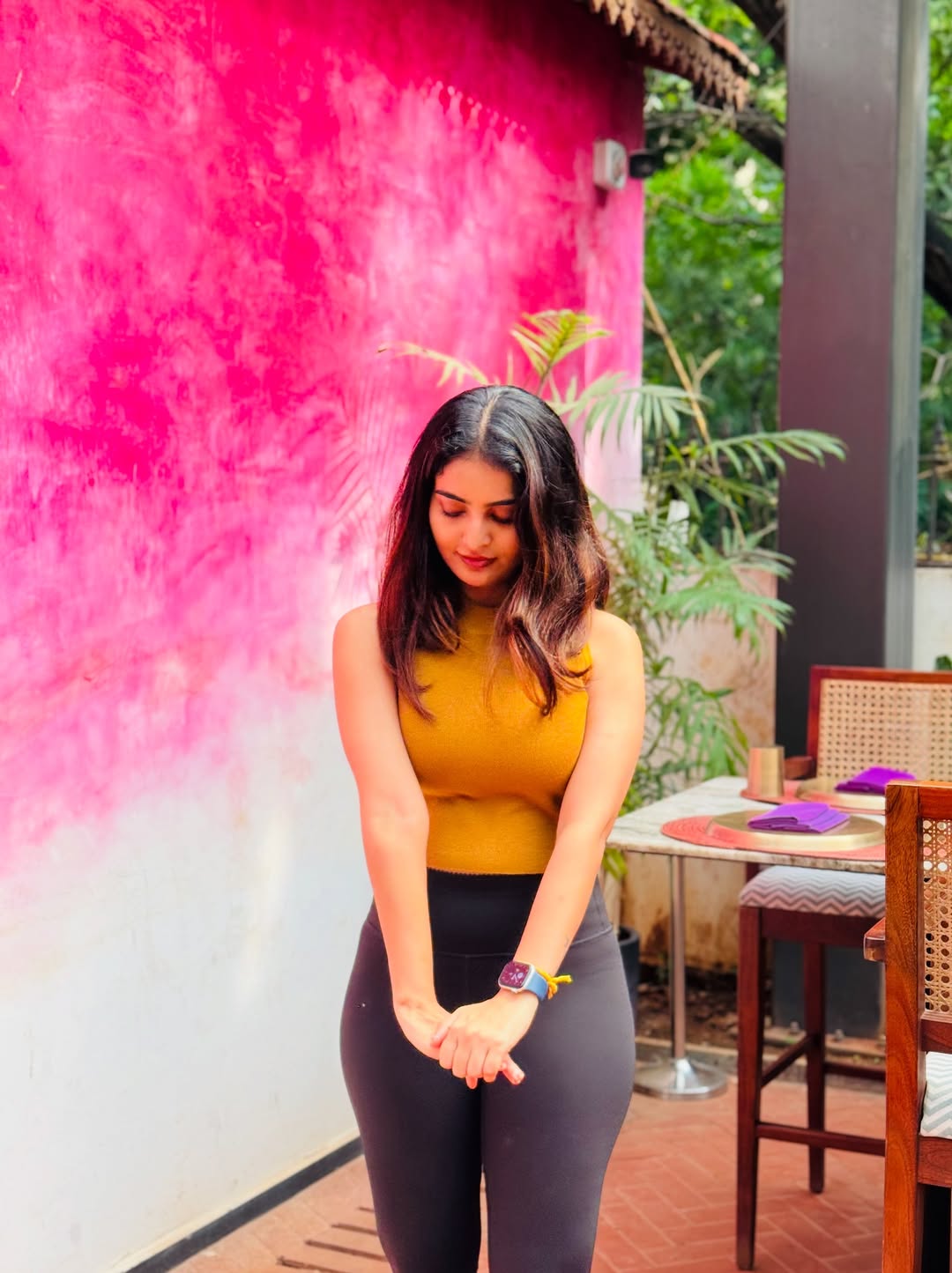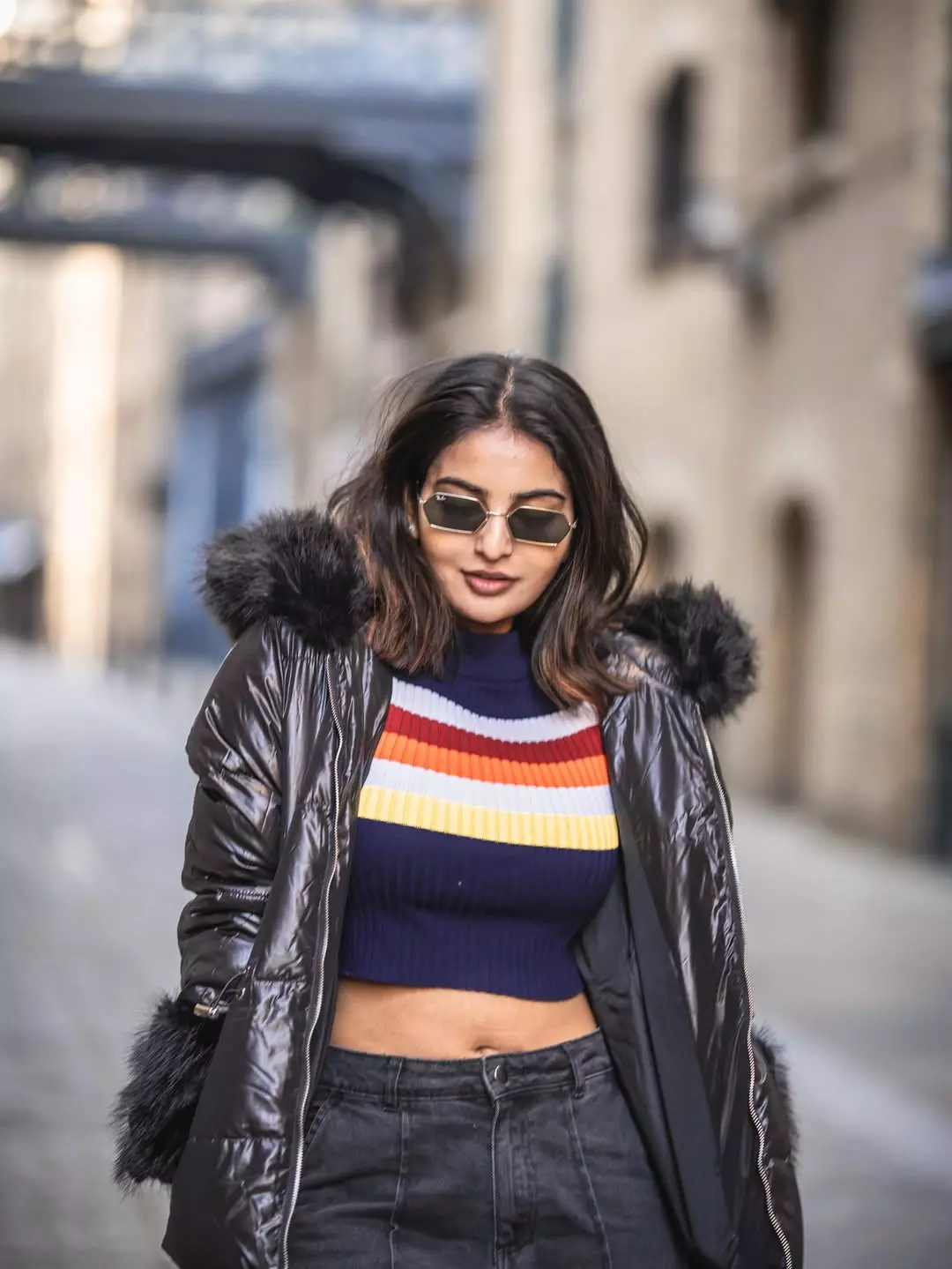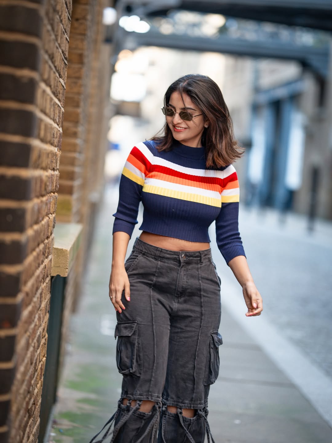 Ananya Nagalla, the talented Telugu actress known for her natural charm and versatile performances, continues to win hearts with her effortless style and rising stardom. In this vibrant street-style photoshoot captured in a charming London alleyway with exposed brick walls and industrial arches, she radiates confidence and joy. Sporting a cropped, ribbed navy blue sweater featuring bold horizontal stripes in red, orange, white, and yellow, paired with high-waisted grey cargo pants featuring dramatic side slits, frayed edges, and multiple pockets for an edgy twist. Her long dark hair flows freely, aviator sunglasses add a cool factor, and a warm smile lights up her face as she strolls casually, exuding youthful energy and modern fashion flair.