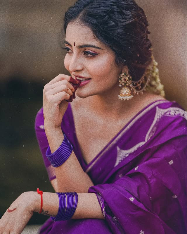 In her recent post, she wore a purple saree from chitrasareeboutique. The saree had detailed embroidery. It matched her soft and subtle style. Her look was styled by vinnu_baby9. She added charm with floral jewellery from the_jewel_gallery. Her makeup was done by cheritanmakeupstudio.