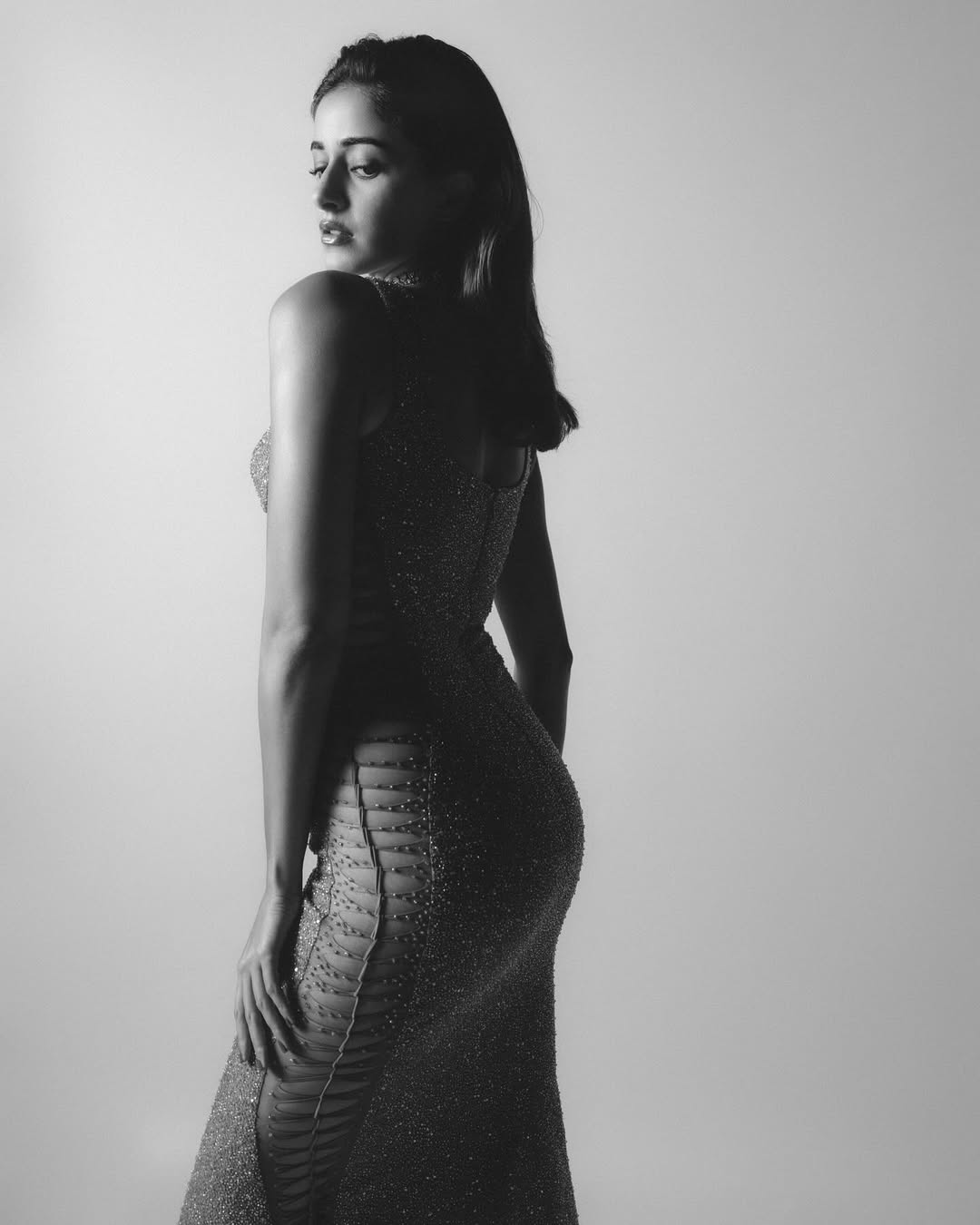 In the photo, Ananya posed in a glittering dress. The design of the dress had a unique side pattern. Her look gave a stylish and classy vibe. She paired the look with simple makeup.