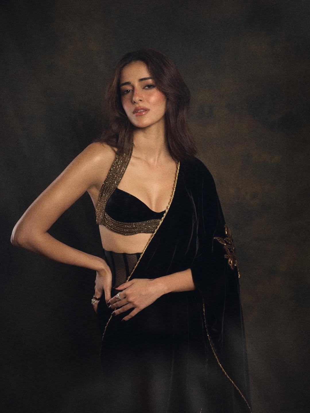Ananya Panday exudes regal elegance in this breathtaking photoshoot, draped in a luxurious black velvet saree with a daring embellished black velvet blouse featuring golden chain details and a flowing cape adorned with intricate gold embroidery.
