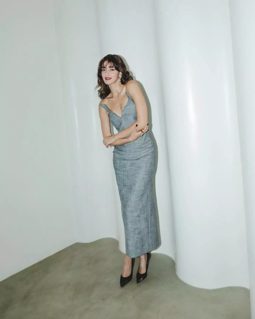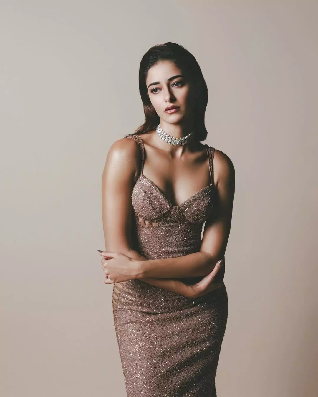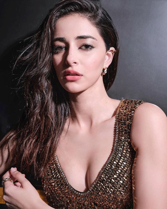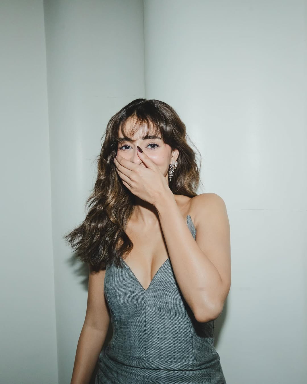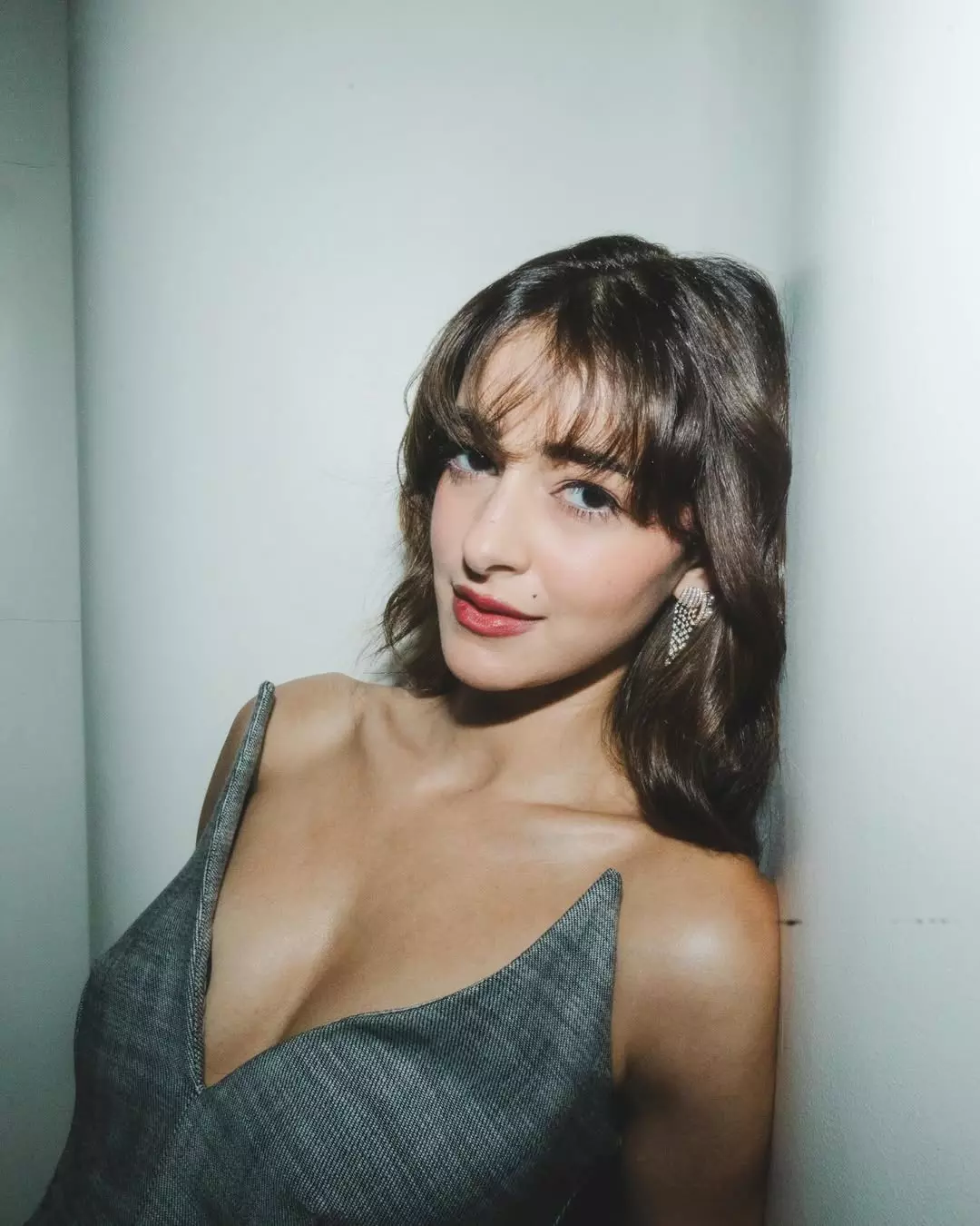 In this stunning look, Ananya dons a sophisticated grey ensemble with a plunging neckline, combining elegance with contemporary style. Her delicate earrings and effortless hair perfectly complement the outfit, creating a look that is both glamorous and approachable. The photo captures her confident poise, resonating with fans and fashion enthusiasts alike.