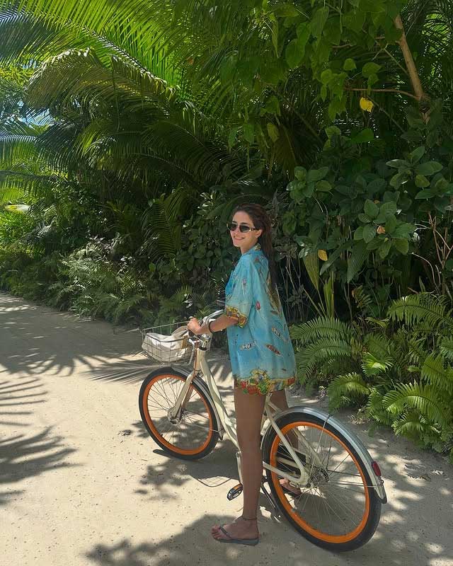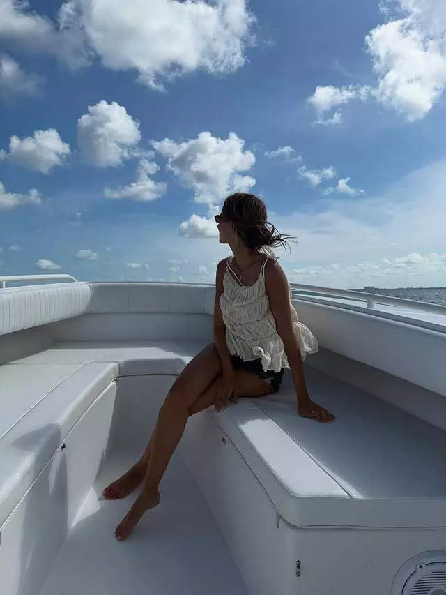 Actress Ananya Panday brings effortless charm to her Miami getaway, flaunting a breezy, offwhite frilled top paired with chic denim shorts. Relaxing on a boat under the clear blue sky, she looks radiant and carefree, capturing the perfect blend of beach fashion and youthful energy. Her minimal makeup, sunkissed glow, and trendy sunglasses round off the ultimate tropical vibe.