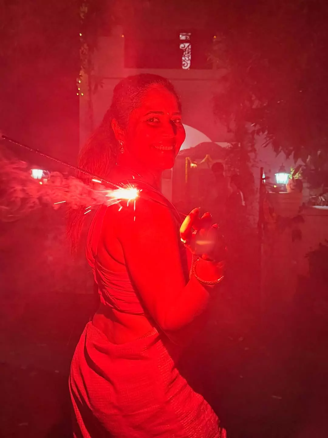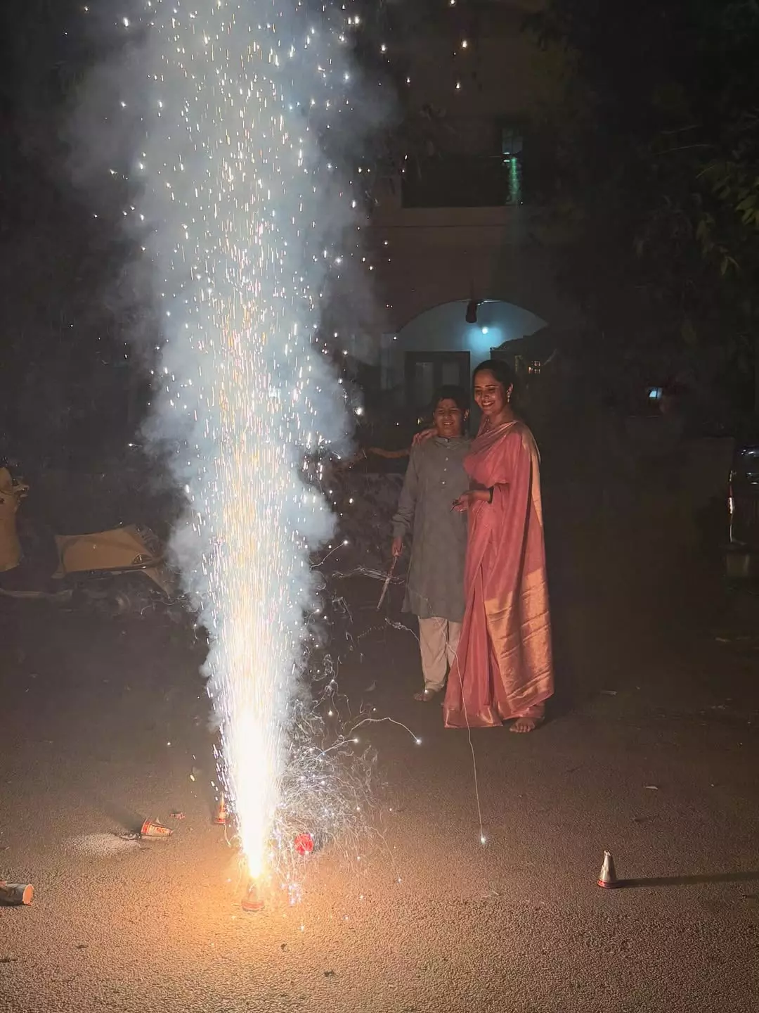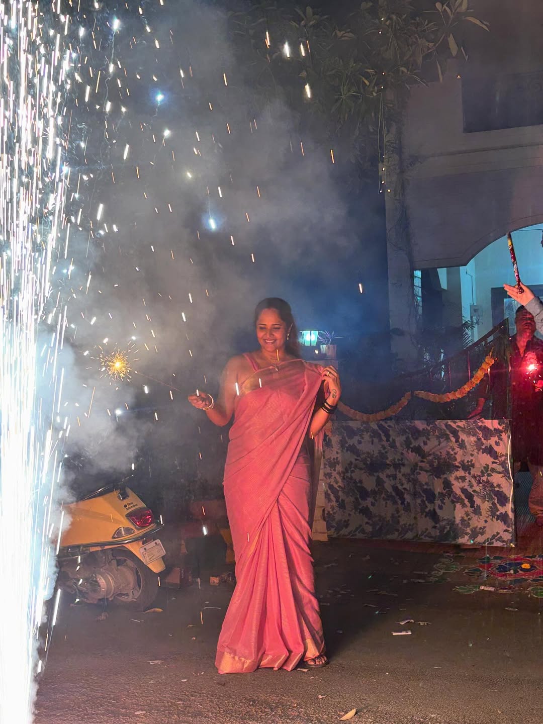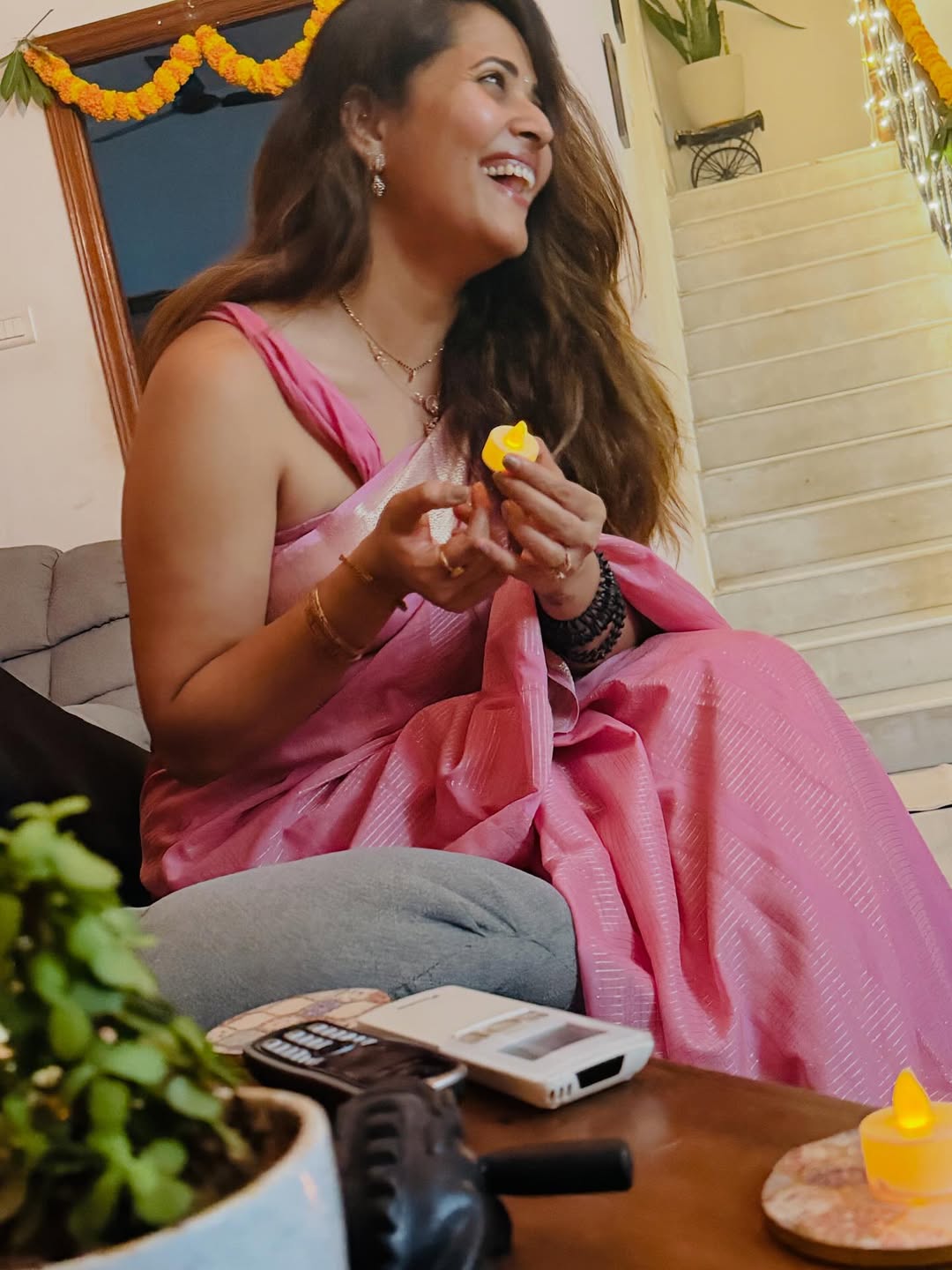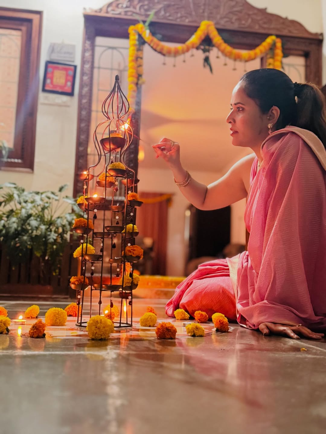 This intimate celebration beautifully showcases the heart of Diwali — love, bonding, and shared happiness. Anasuya’s natural glow and beaming smile mirror the flickering diyas around her, creating an atmosphere filled with peace and prosperity.