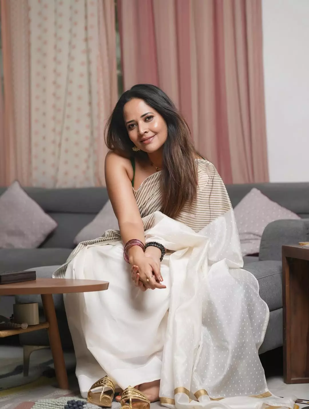 Anasuya is once again in the spotlight after sharing her latest Instagram photo. In this picture, she is seen wearing a soft white saree with light beige stripes paired with a green blouse.