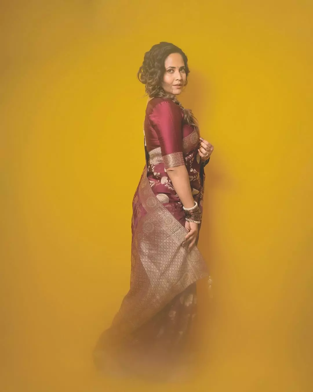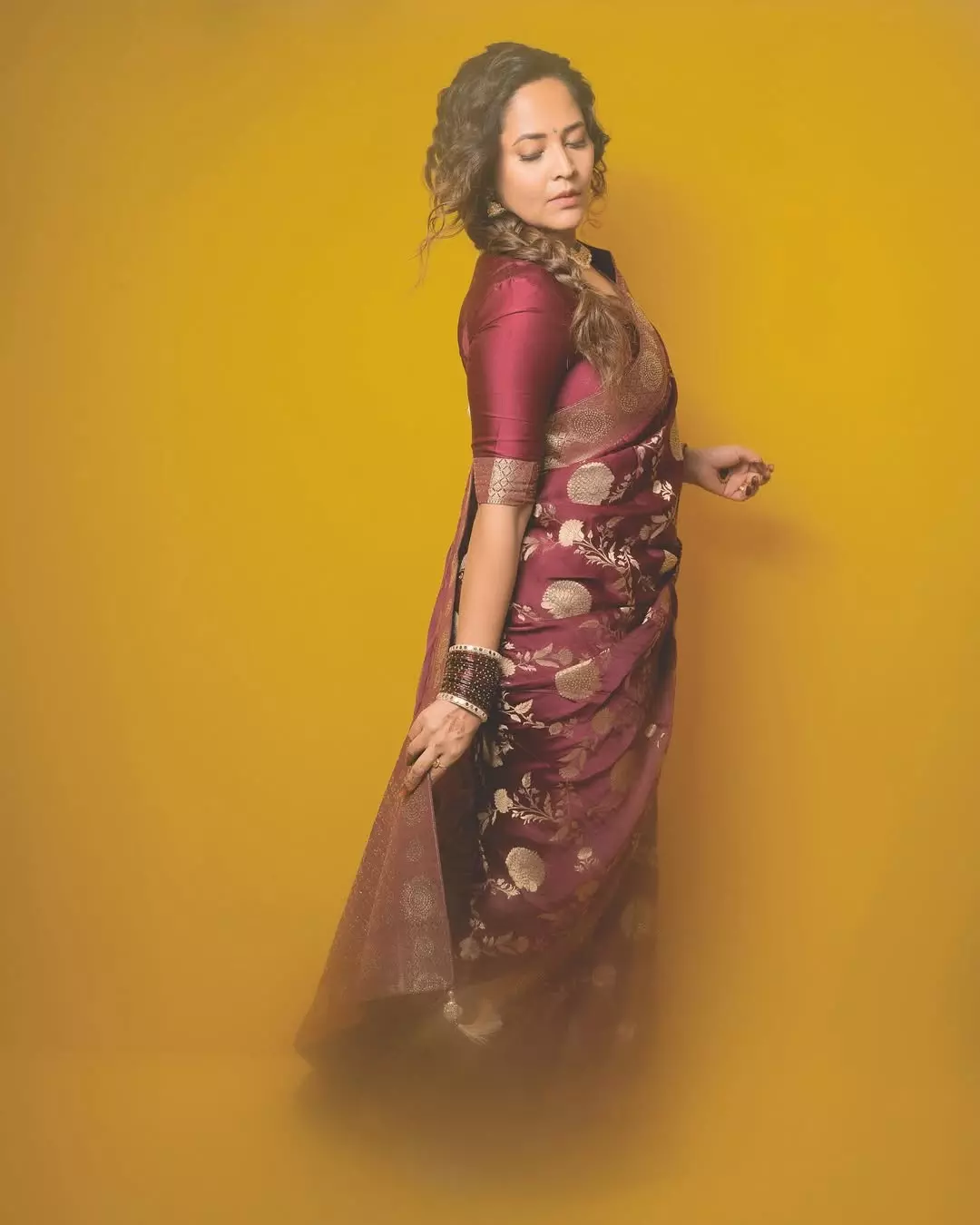 Her latest pictures have gone viral, drawing admiration from fans who hailed her as “a true marvel” for blending elegance with fearless individuality. With her signature curly hair styled into a braid, wrapped in a garnet-hued saree, and exuding confidence from every frame, Anasuya truly personifies her own words —