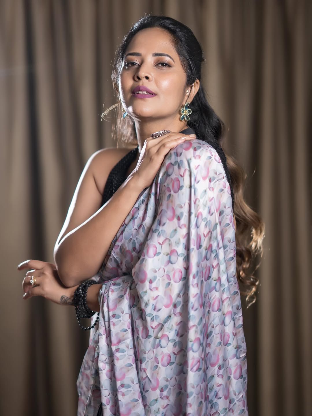 In the shared picture, Anasuya is seen wearing a soft-colored saree with a stylish black blouse. The look is graceful and modern at the same time. Her long wavy hair adds elegance, and her confident pose clearly reflects self-belief. The caption of the post reads, “Don’t wish for it. Work for it.”