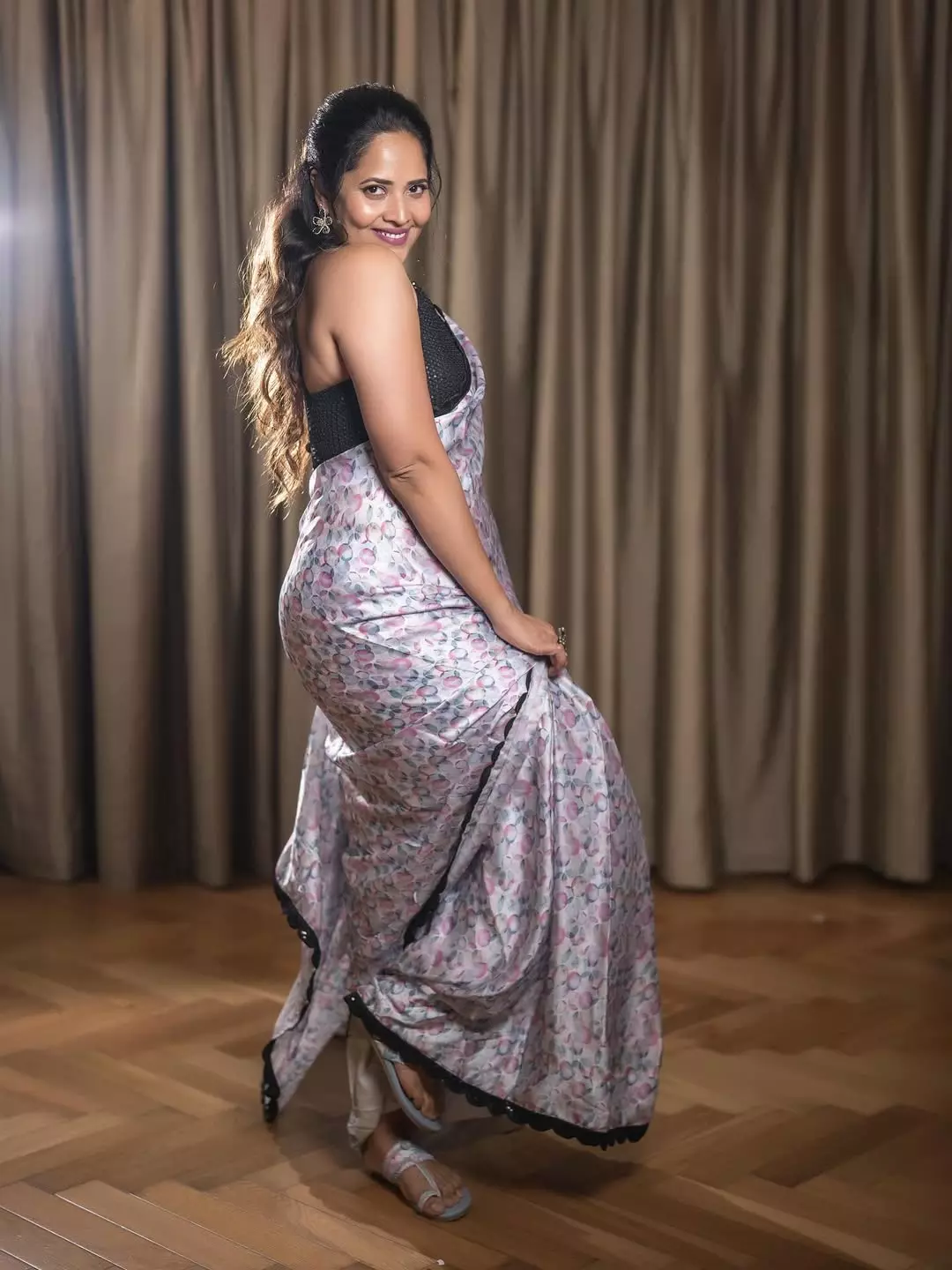 In the shared picture, Anasuya is seen wearing a soft-colored saree with a stylish black blouse.