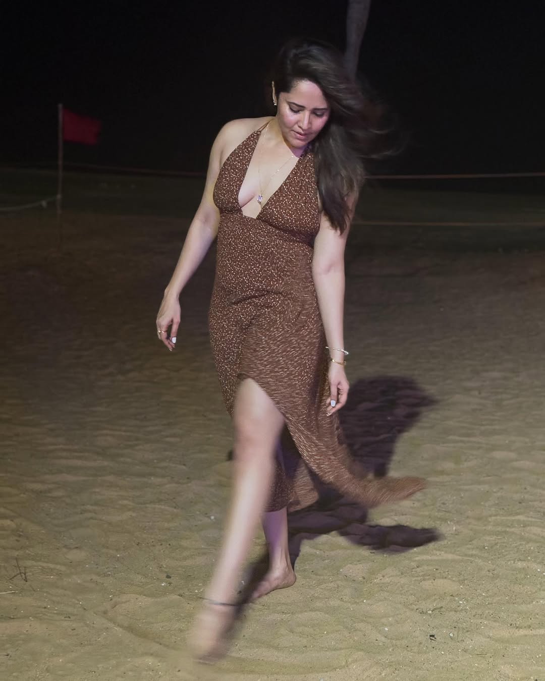By: Tupaki Desk | 6 March 2026 11:16 AM ISTAnasuya Bharadwaj shines with effortless elegance in this glamorous event photo, captured under vibrant yellow and purple stage lights at a lively outdoor gathering. Dressed in a deep maroon halter-neck dress with a plunging neckline and subtle polka-dot pattern, she exudes confidence and allure. Her wavy hair cascades over one shoulder, while bold makeup, statement gold jewelry—including a pendant necklace and rings—accentuates her radiant smile and upward gaze, making her the focal point amid the festive crowd and tents.