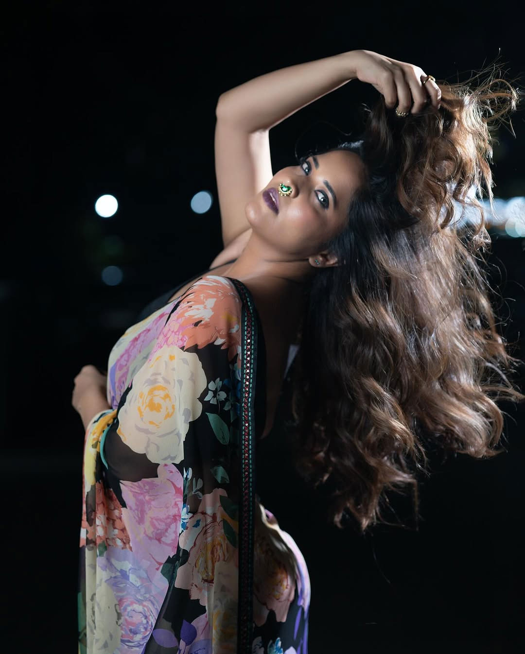 In the photo, she is seen sitting under a tree, wrapped in a simple white saree dotted with colorful patterns.
