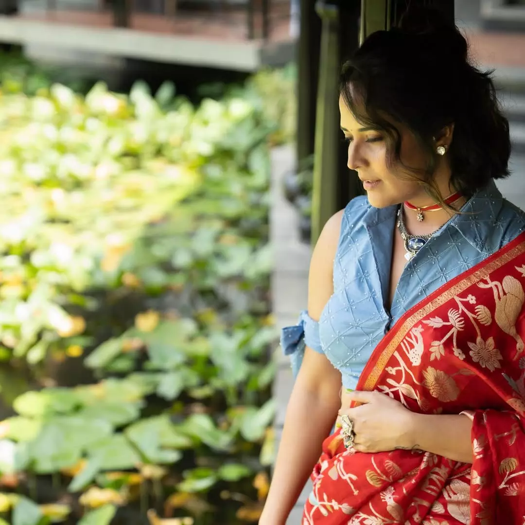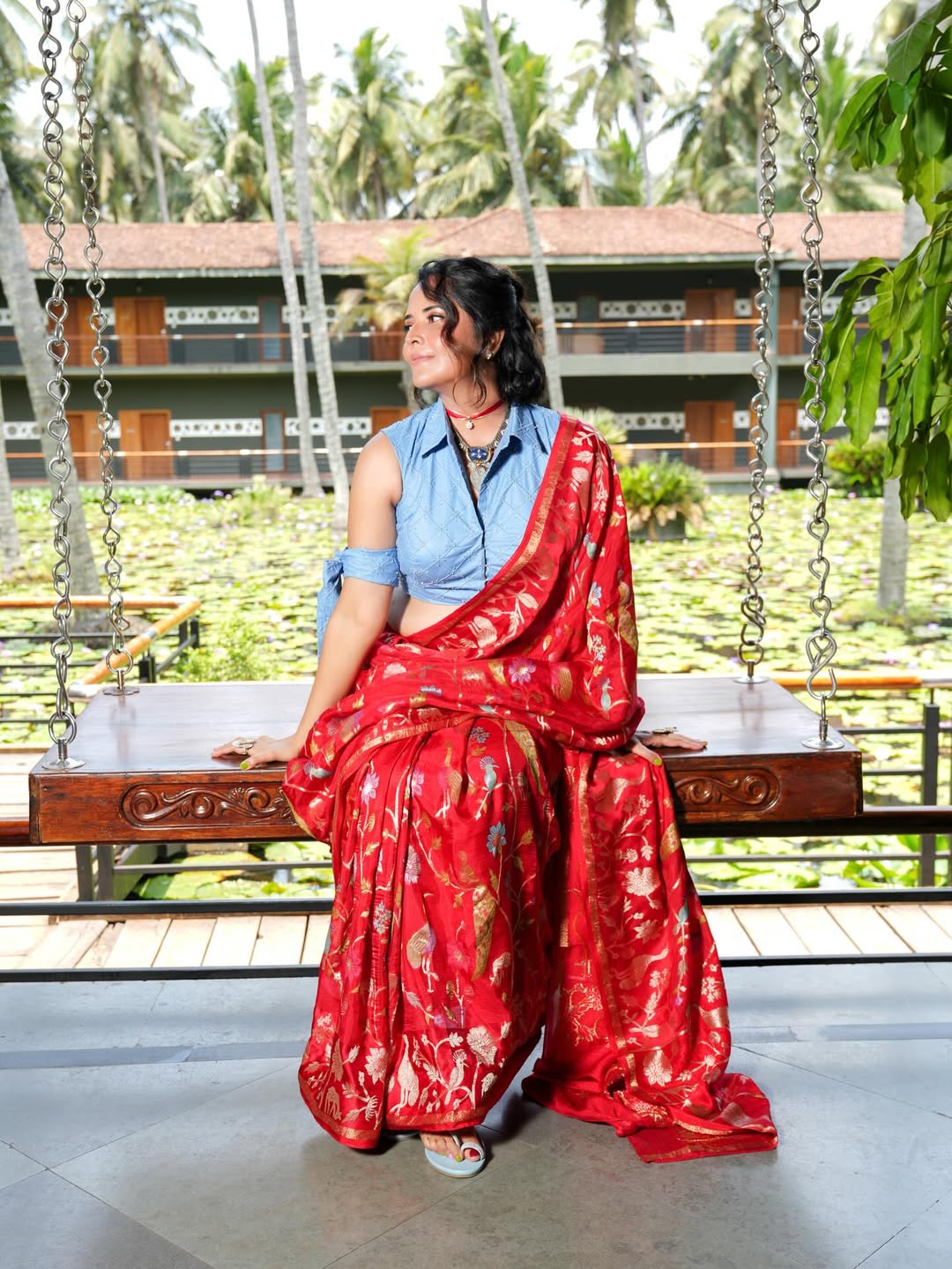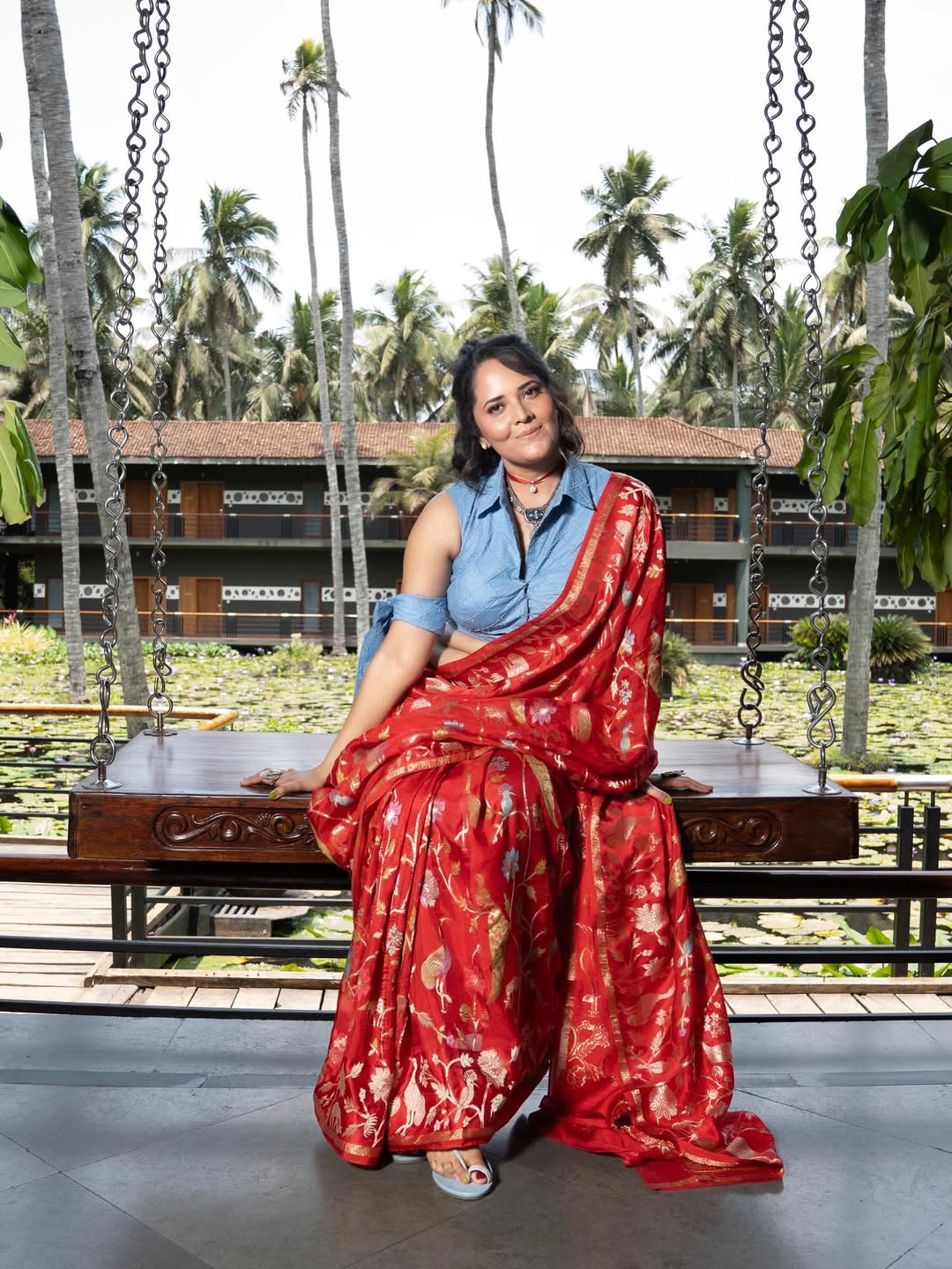Anasuya Bharadwaj turns heads in a striking traditional look that blends modern elegance with timeless charm. Posing gracefully on a rustic wooden swing against a lush coconut grove backdrop, she radiates confidence and calm. The vibrant red saree with golden motifs paired with a denim-style blouse creates a refreshing fusion statement, highlighting her bold fashion sensibility. The serene tropical setting enhances her effortless screen presence, making the frame feel like a postcard moment captured in real life.