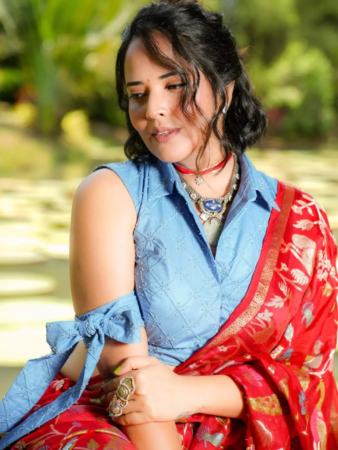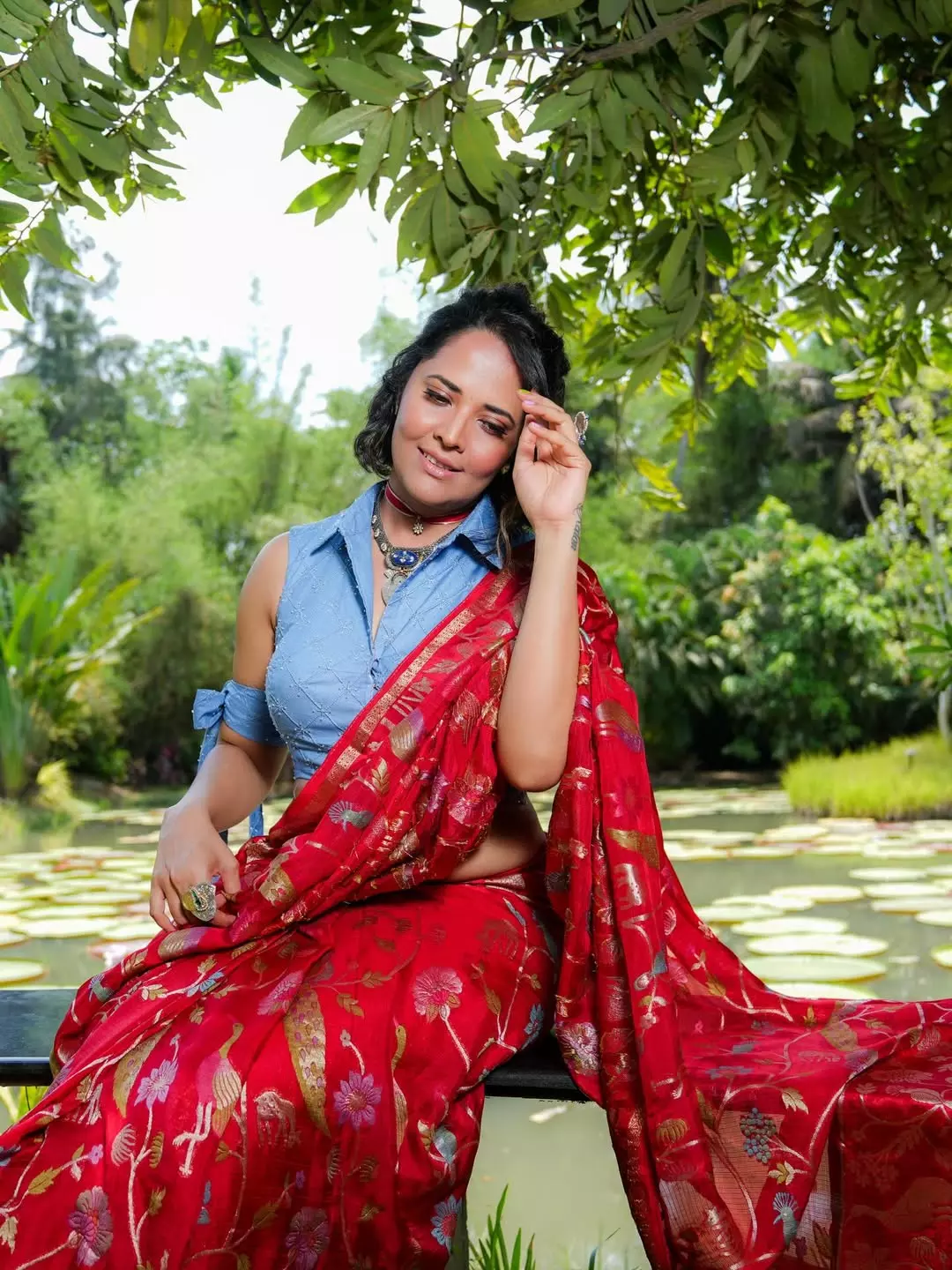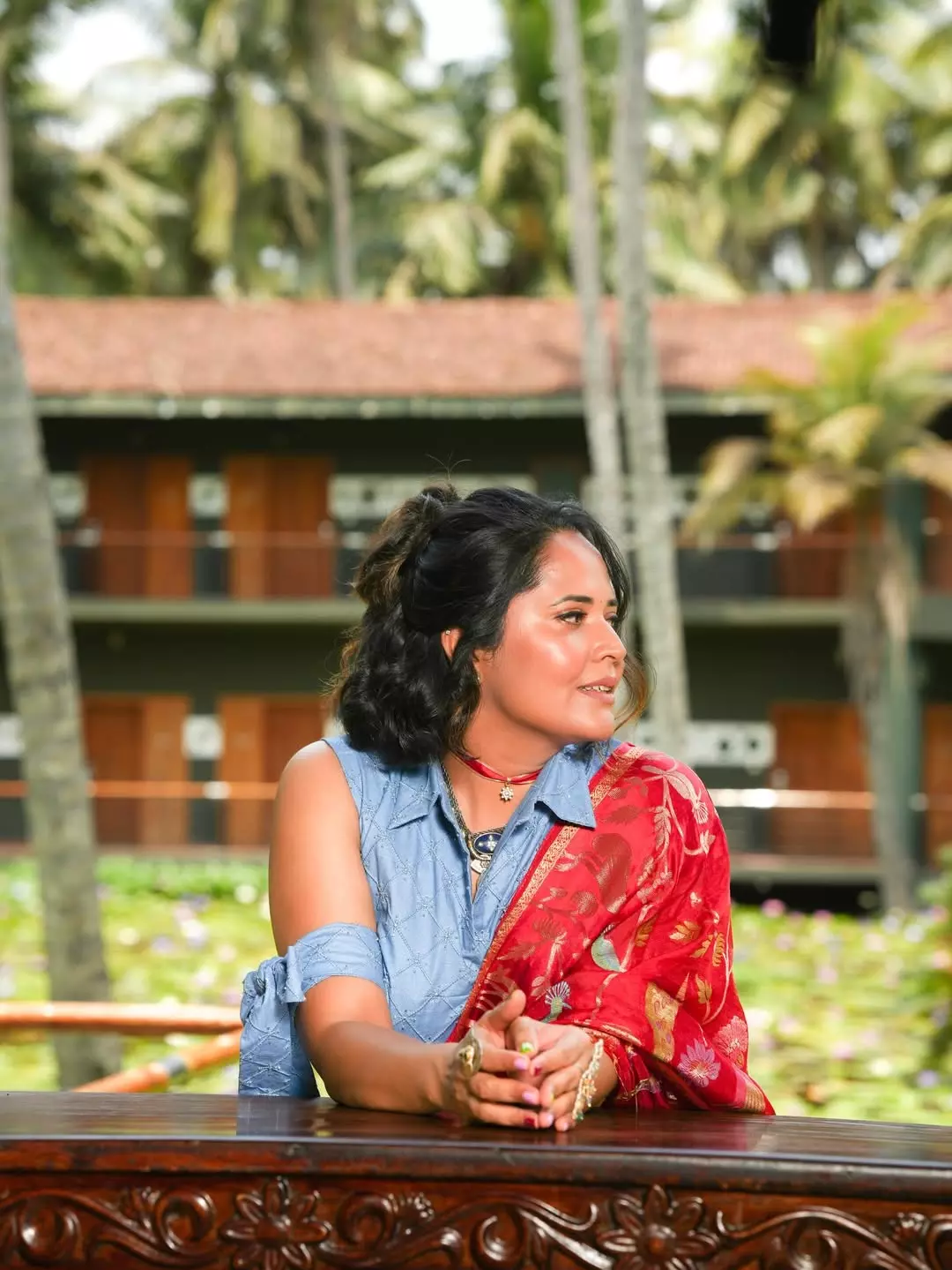 Anasuya Bharadwaj turns heads in a striking traditional look that blends modern elegance with timeless charm. Posing gracefully on a rustic wooden swing against a lush coconut grove backdrop, she radiates confidence and calm. The vibrant red saree with golden motifs paired with a denim-style blouse creates a refreshing fusion statement, highlighting her bold fashion sensibility. The serene tropical setting enhances her effortless screen presence, making the frame feel like a postcard moment captured in real life.