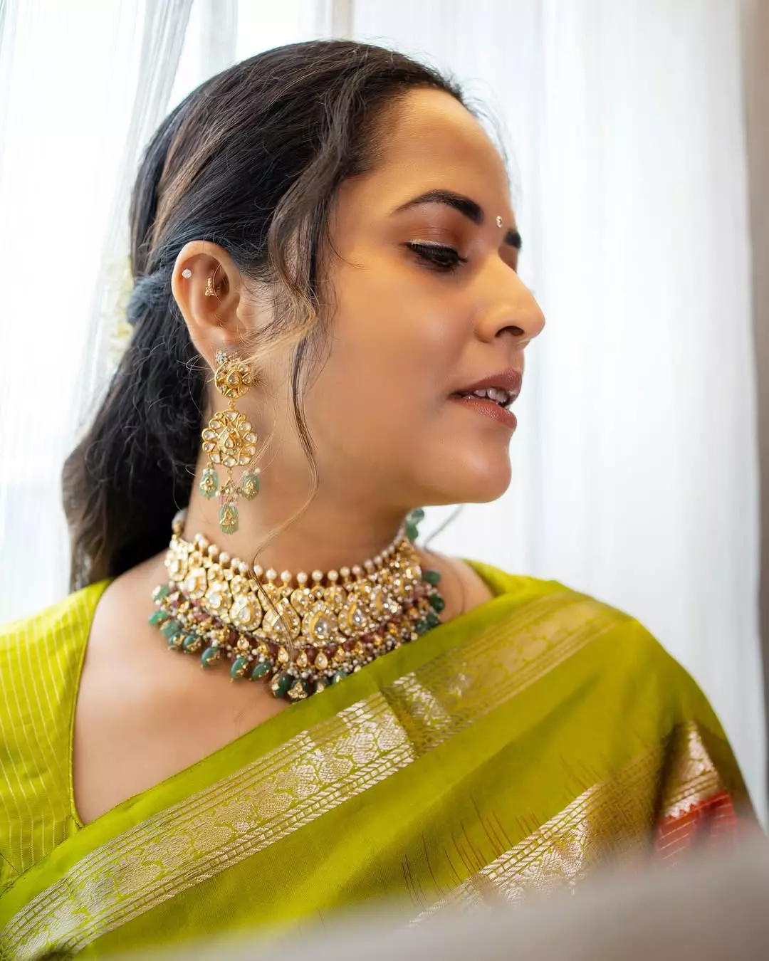 Actress Anasuya Bharadwaj shared a new picture on Instagram. She wore a bright green and pink silk saree. She paired it with a designer blouse. Her jewelry included a choker, earrings, bangles and rings. In her caption, she wrote, “She flirts with the light.. dances with stillness and holds your gaze like a whispered secret ✨ #DreamInMotion”.
